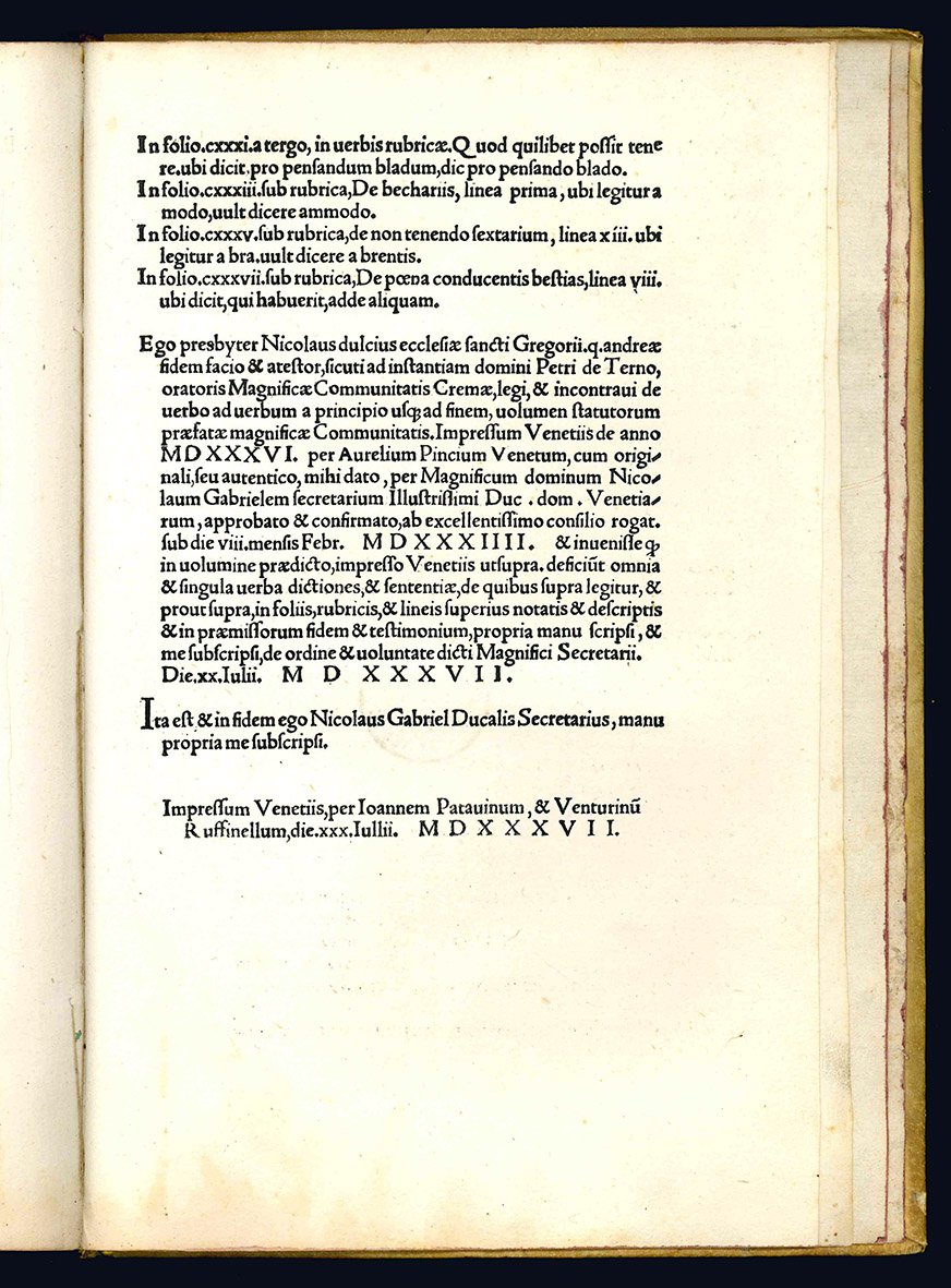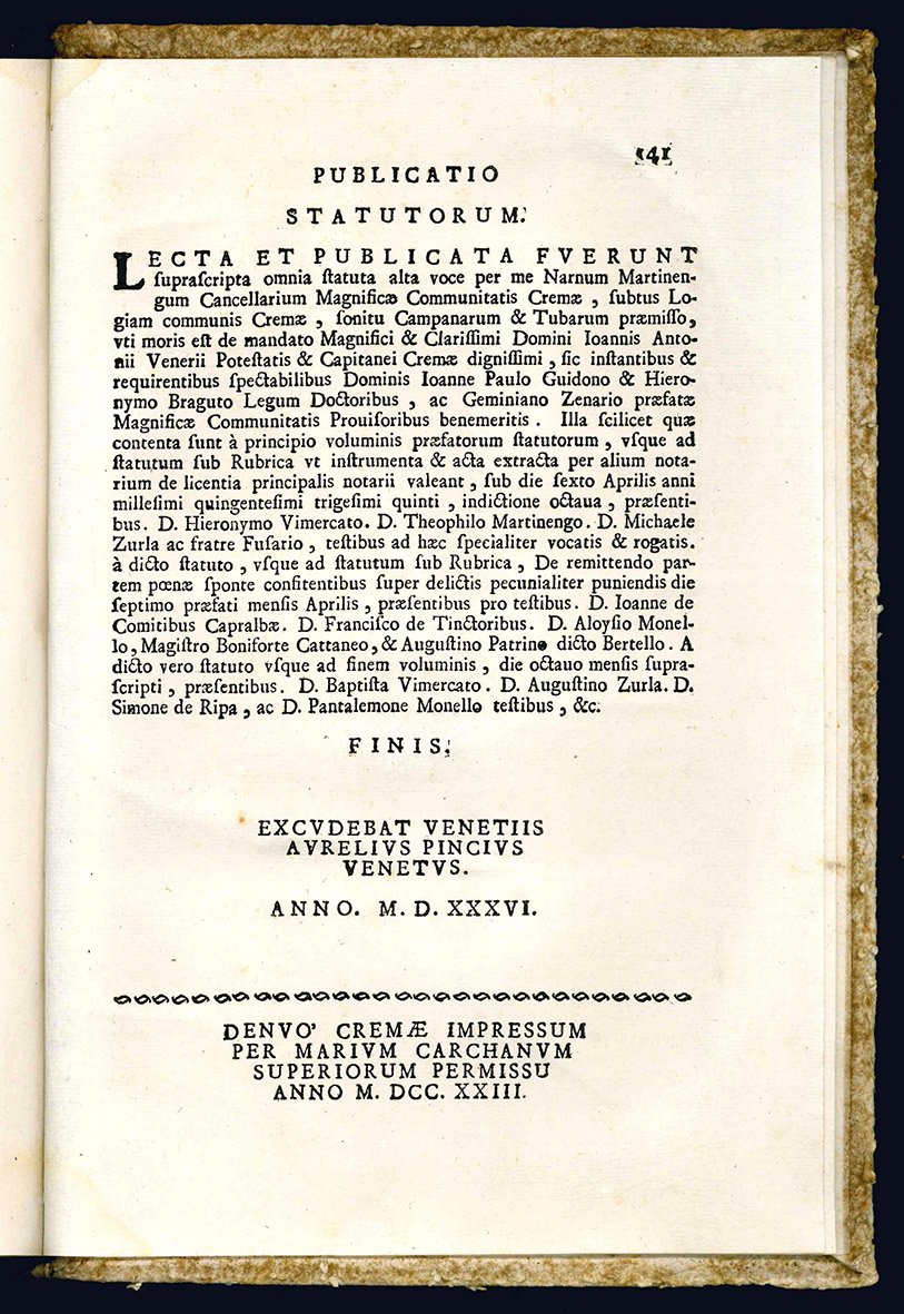 La stampa era stata preceduta, come d'uso, dalla Publicatio statutorum, avvenuta in tre giorni, tra il 6 e l'8 aprile del 1535: “Lecta et publicata fuerunt suprascripta omnia statuta alta voce per me Narnum Martinengum cancellarium magnificae communitatis Cremae, subtus logiam communis Cremae, sonitu campanarum et tubarum praemisso, uti moris est” (p. 140).