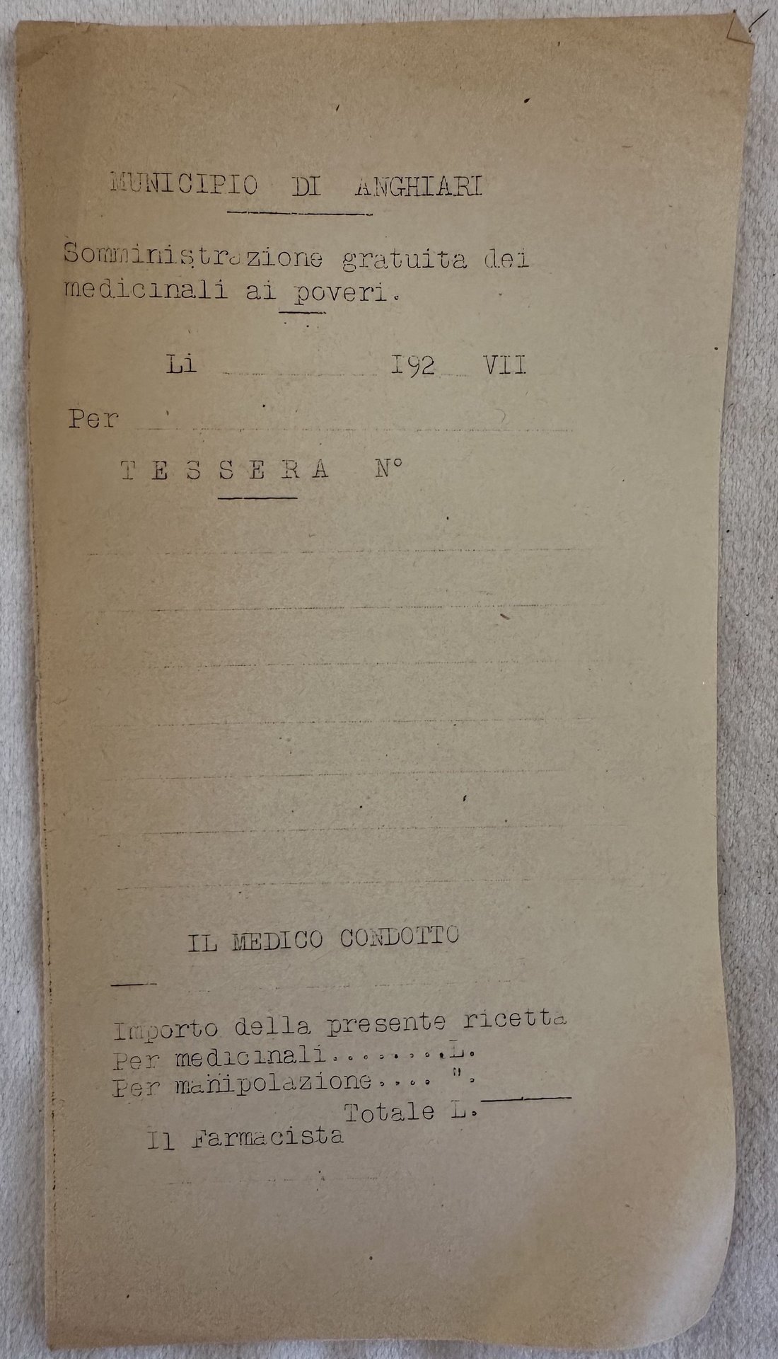 Modulo originale del Municipio di Anghiari per la somministraazione gratuita dei medicinali ai poveri. Senza data ma degli anni '20. In buone condizioni. In 8. 21x11,5 cm.Original form of the Municipio of Anghiari for the free distribution of drugs to poor people. Not dated but of 1920's. In good conditions. In 8. 21x11,5 cm.
