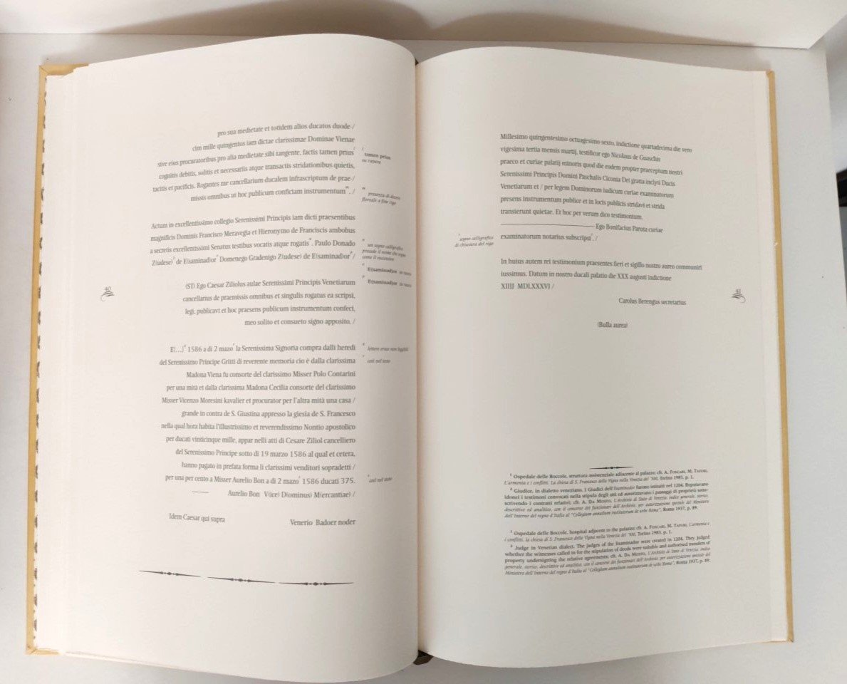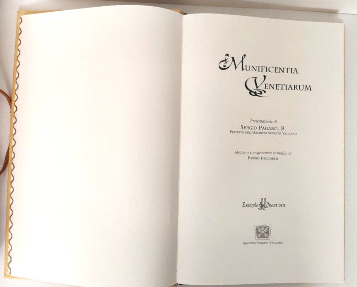 due volumi primo volume titolo -Munificentia Venetiarum presentazione-Sergio Pagano B. prefetto dell'archivio segreto vaticano ideazione progettazione scientifica-Bruno Becchetti anno-2004 pp.107. bilingue italiano-inglese il secondo volume contiene il sigillo d'oro (si tratta di una semplice doratura) del doge Pasquale Cicogna è la riproduzione fedele del documento originale pergamenaceo, del 1586. splendida e rara opera per amatori. come nuovo alcuni graffi sulla custodia in pelle, la custodia a sacco in renna con lacci in cuoio presenta aloni di sporcizia.
