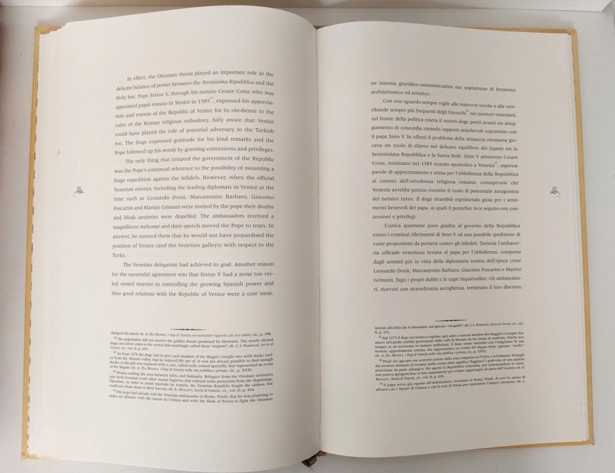 Scelta per il suo particolare valore tra quelle conservate e relative al territorio veneto, la pergamena originale datata 1586 è custodita da secoli presso l'Archivio Vaticano. Questo documento (riferimento d'archivio AA, Arm. I-XVIII, 1302) fu offerto dal doge veneziano Pasquale Cicogna (1585-1595), valoroso uomo d'affari e d'armi, duca di Candia e Rettore di Cipro, a nome della Serenissima Senato di papa Sisto V, quale magnifica residenza del suo oratore nel governo veneziano, il palazzo di proprietà della famiglia Gritti, già residenza del doge Andrea Gritti (1533-1538), "in contrata Sanctae Iustinae, penes ecclesiam Sancti Francisci super Campo" dove visse (in piccola parte) il Nunzio Apostolico a Venezia. Il sigillo d'oro del Doge Pasquale Cicogna è unito al documento da un filo di seta rossa percorso da fili d'oro. Conservata da secoli nell'Archivio Segreto, la famosa collezione di sigilli d'oro vaticani è tra le più importanti al mondo. Re, Principi e Imperatori hanno inviato nel corso dei secoli i loro messaggi ai Papi, corroborando i documenti con il loro sigillo in segno di devozione, che nelle occasioni speciali era d'oro. Questa edizione esclusiva e unica guiderà i suoi fortunati possessori in un viaggio indietro nel tempo, alla Venezia dei Dogi. Il documento finemente miniato è stato scelto per la sua eccezionale opera artistica, ed è corroborato dallo splendido sigillo d'oro del Doge Pasquale Cicogna; la preziosa edizione critica darà al fortunato possessore dell'"Esemplare" l'occasione di conoscere la storia storico-politica della Serenissima Repubblica e la ricchezza del carteggio dei Dogi e l'ampio valore e preziosità dei suoi contenuti.