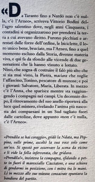 «Da Taranto fino a Nardò non c'è nulla, c'è l'Arneo», scriveva Vittorio Bodini dell'agro salentino dove, negli anni Cinquanta, i contadini si organizzarono per prendersi la terra a cui avevano diritto. Furono picchiati e arrestati dalle forze dell'ordine, le biciclette, il loro unico bene, bruciate, ma l'Arneo, fino a quel momento escluso dalla Storia, divenne materia viva, e qui fa da sfondo alle vicende di due generazioni che là hanno vissuto e lottato. Nino, che sogna di costruire il falò più alto che si sia mai visto, la Pietra, maciara che toglie l'affascino, Tonino, pescatore di murene; e poi i giovani: Salvatore, Maria, Liberata. In mezzo c'è l'Anna, che sparisce mentre sta raggiungendo i compagni nei campi. Un decennio dopo, il ritrovamento del suo anello riporterà alla luce quel mistero, rivelando l'anima più nascosta dei compaesani in un Sud tagliato fuori dalle cartoline, dove appunto «non c'è nulla, c'è l'Arneo».