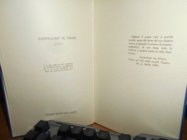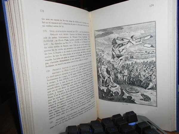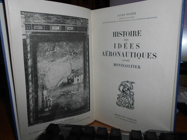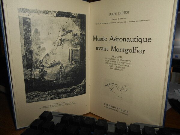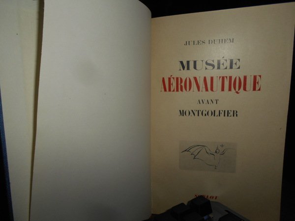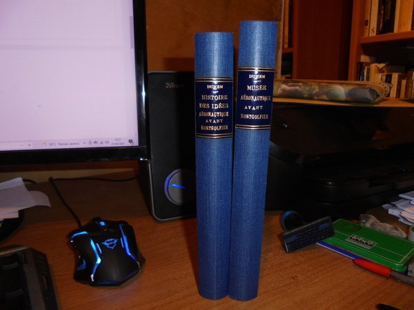 JULES DUHEM. Paris, Fernand Sorlot, 1943/1944. Musée Aéronautique avant Montgolfier. Recueil de figures et de documents pour servir a l' histoire des idées aéronautiques avant l' invention des Aérostat. Histoire des Idées Aéronautiques avant Montgolfier. 2 volumi in-8°, tela bleu con titoli in oro entro tasselli ai dorsi, copertine originali conservate nel vol. primo. 253, (5) pp. con numerose illustrazioni in nero n.t.; 458, (15) pp. senza illustrazioni (es. n° 82). Tirature limitate. Uff. C - I - 6