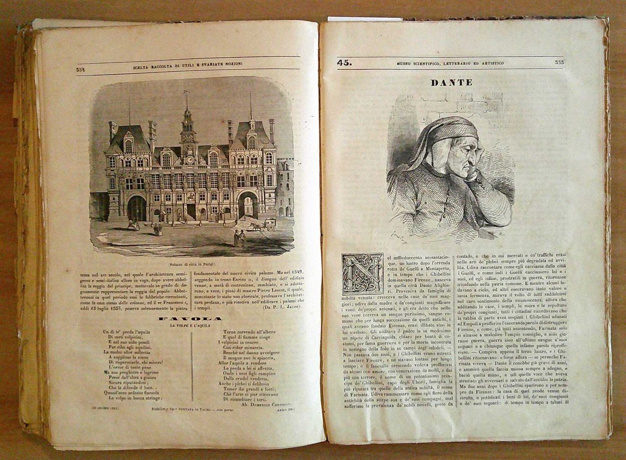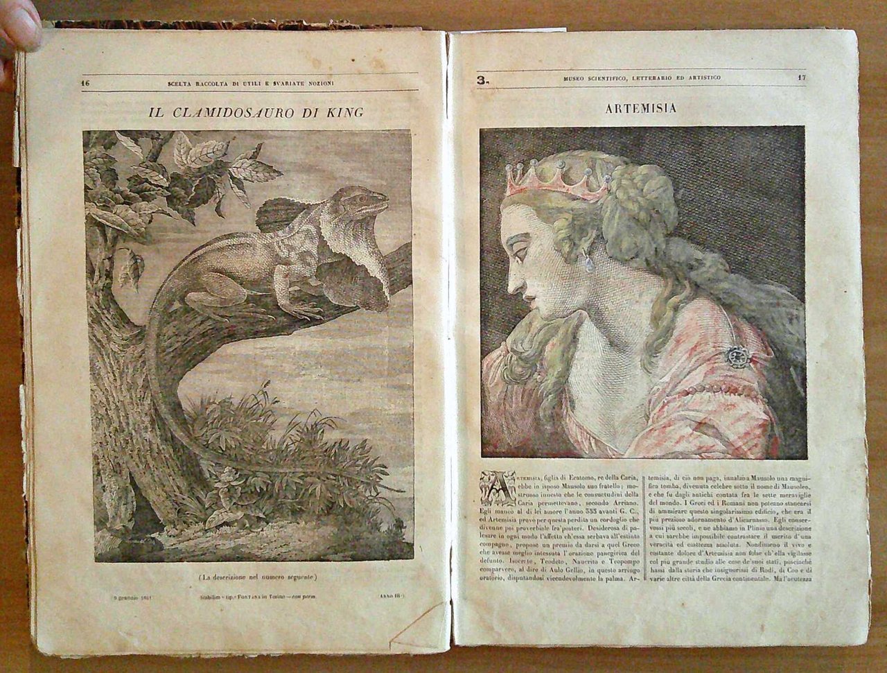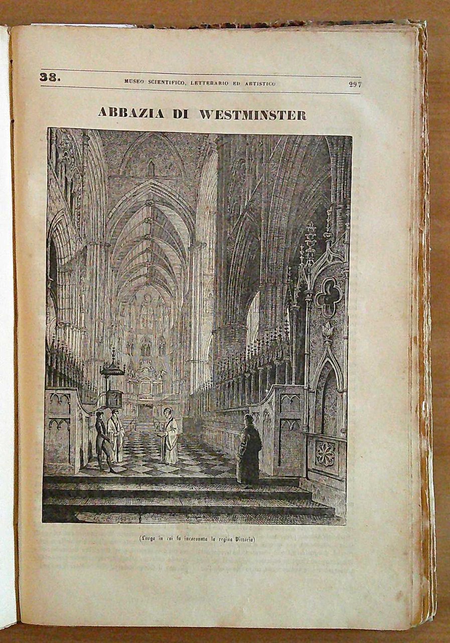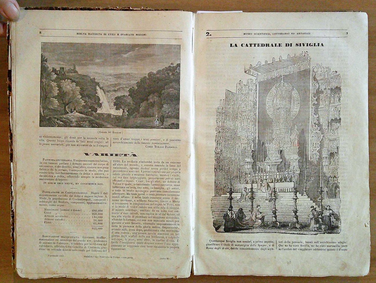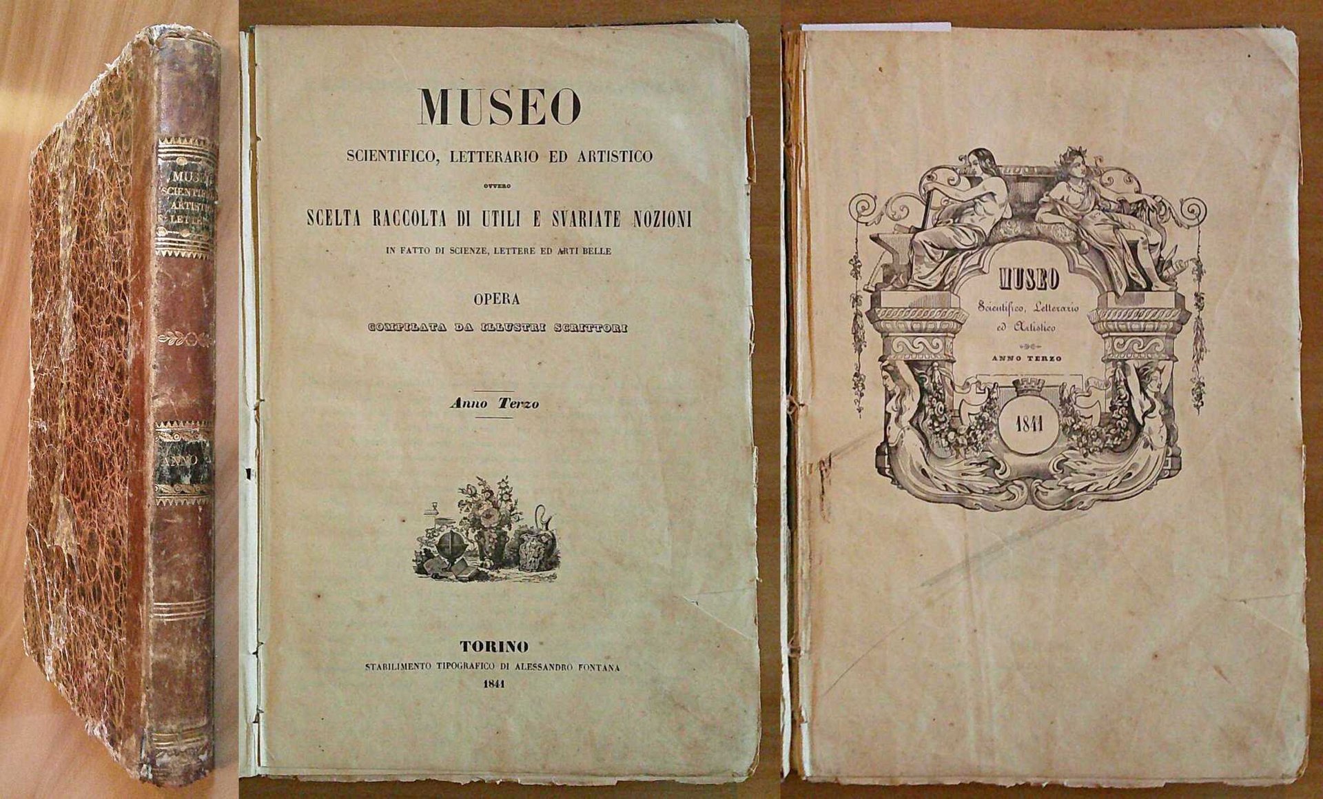 Museo Scientifico, Letterario ed Artistico ovvero Scelta raccolta di utili e svariate nozioni in fatto di scienze, lettere ed arti belle. Anno Terzo. Molte incisioni in b/n n.t., anche a piena pagina. Stabilimento Tipografico di Alessandro Fontana - Torino, 1841. Rilegatura coeva con titoli al dorso con macchie e mancanze alle copertine. Inevitabili segni del tempo in qualche pagina (un segno a penna, taglietti, piccole mancanze o lievi fioriture che non ledono il testo). Mancanza della quartina di pag.167/168 (argomento trattato: Breve sunto della teoria atomica). L'Incisione di pagina 145 è stata acquarellata al tempo e le pagine 208/209 presentano una macchia non passante. 20x29; pp.416. Raro e in Buonissimo stato. , Molto buono (Very Good)