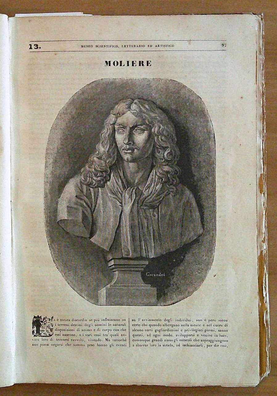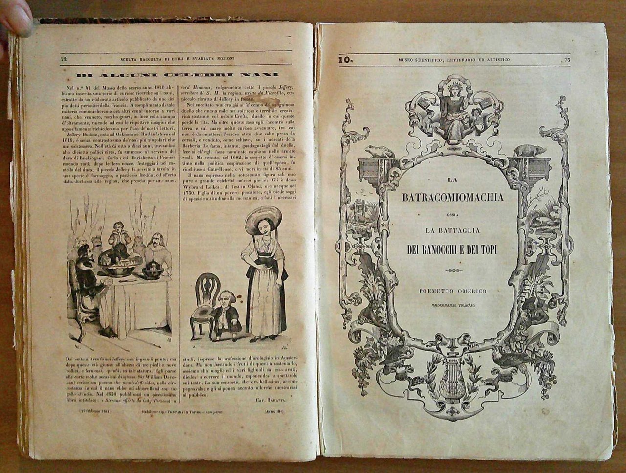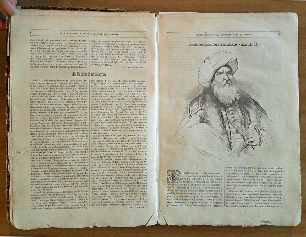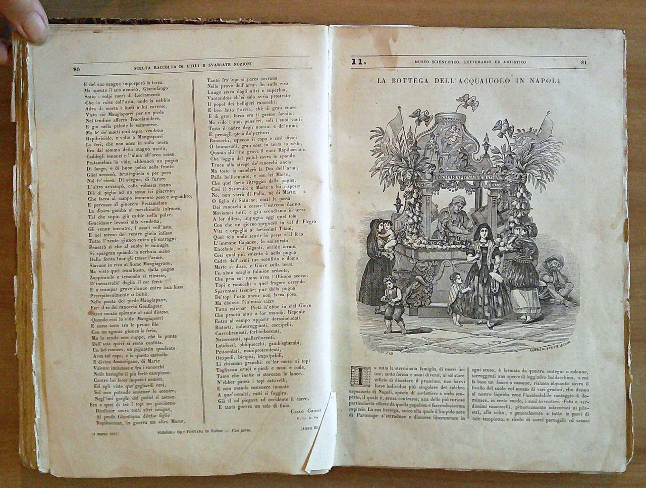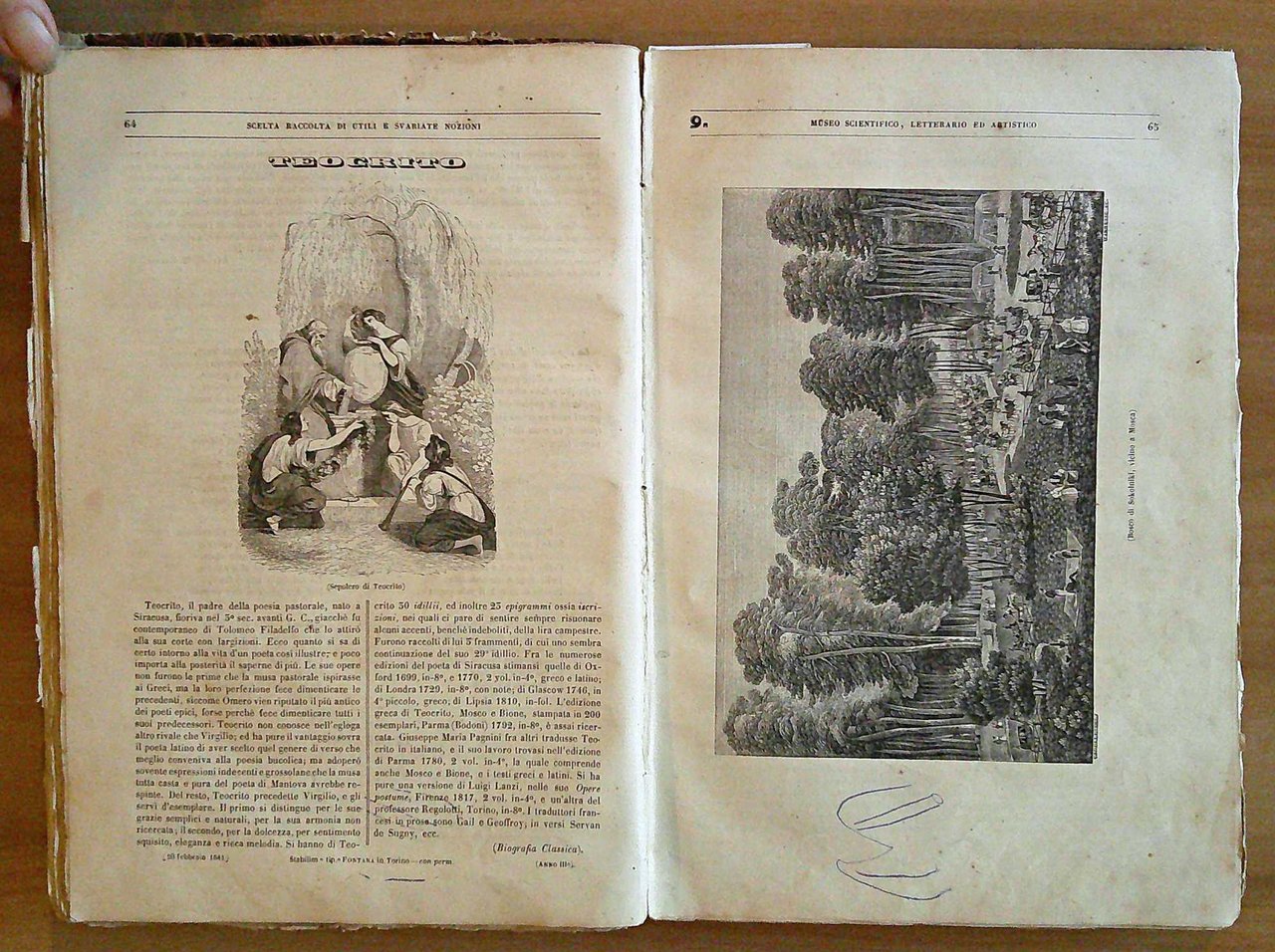 Museo Scientifico, Letterario ed Artistico ovvero Scelta raccolta di utili e svariate nozioni in fatto di scienze, lettere ed arti belle. Anno Terzo. Molte incisioni in b/n n.t., anche a piena pagina. Stabilimento Tipografico di Alessandro Fontana - Torino, 1841. Rilegatura coeva con titoli al dorso con macchie e mancanze alle copertine. Inevitabili segni del tempo in qualche pagina (un segno a penna, taglietti, piccole mancanze o lievi fioriture che non ledono il testo). Mancanza della quartina di pag.167/168 (argomento trattato: Breve sunto della teoria atomica). L'Incisione di pagina 145 è stata acquarellata al tempo e le pagine 208/209 presentano una macchia non passante. 20x29; pp.416. Raro e in Buonissimo stato. , Molto buono (Very Good)