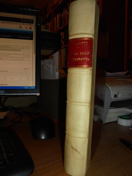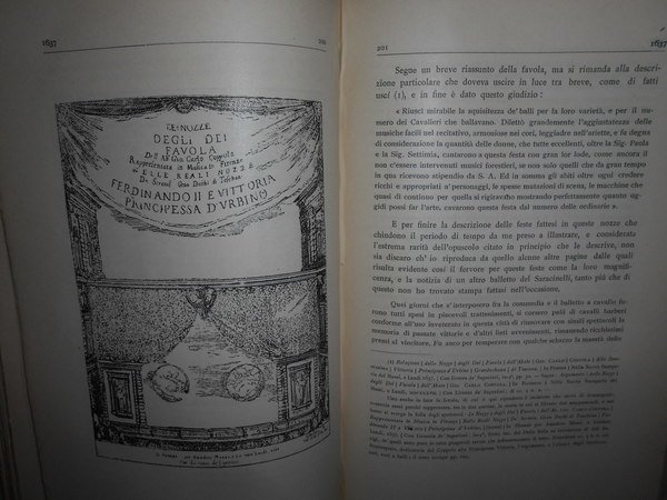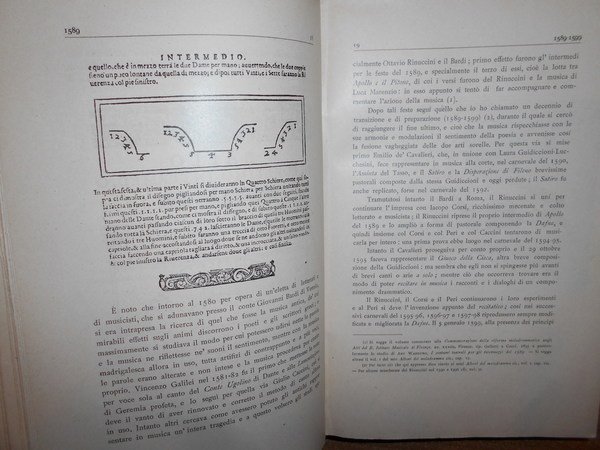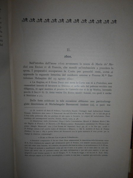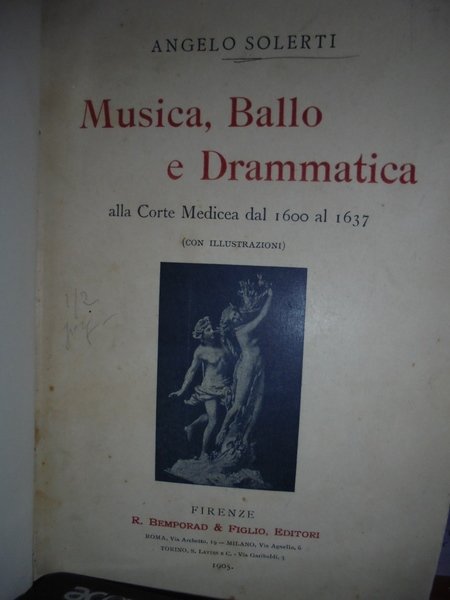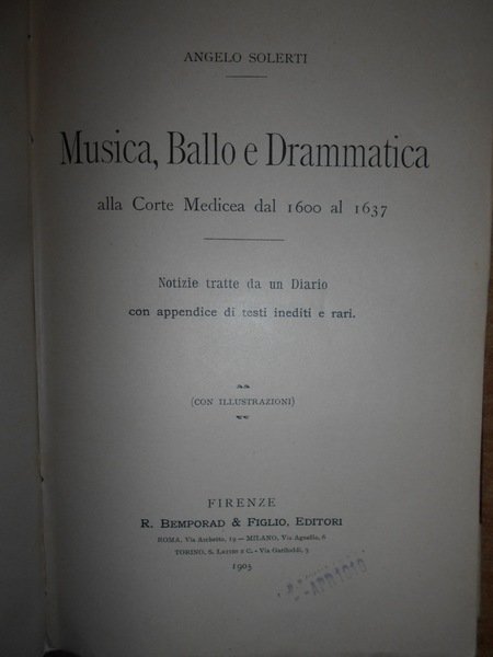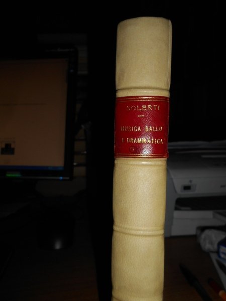 Angelo, Solerti. Firenze, R. Bemporad & Figlio, Editori, 1905. MUSICA, BALLO E DRAMMATICA ALLA CORTE MEDICEA DAL 1600 AL 1637. Notizie tratte da un Diario con appendice di testi inediti e rari. Edizione originale. In-8°, m-pergamena coeva con angoli, brossure originali conservate. xvi, 594, (2) pp. con illustrazioni nel testo. Bell' esemplare (intonso). Neg. mob. 14 alto