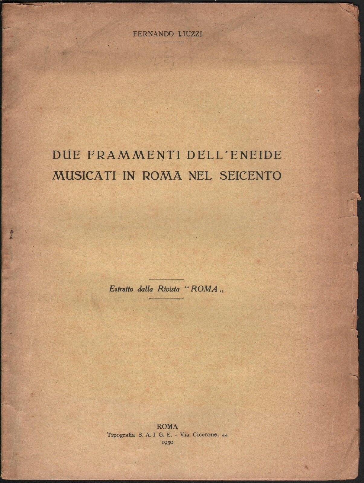 Dettagliata analisi di un passaggio dell'Eneide musicata nel '600. in discrete condizioni, bruniture alla copertina e qualche macchia, strappi ai margini su tutte le pagine, bruniture ai margini delle pagine interne, da pag 495 a pag 504, pp. 10 cm. 24,5 X 18