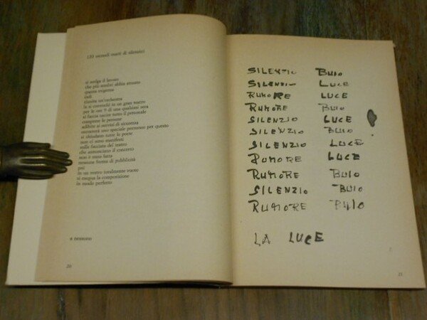In 8°, brossura editoriale con bandelle, titoli in nero su fondo avorio, pp. (4),136,(22). Volume stampato in lingua italiana su carta giallo paglierino ed in lingua inglese su carta azzurrina. All'interno immagini fotografiche in bianco e nero, scritture musicali, elaborazioni poetiche manoscritte riprodotte in facsimile. Testo critico di Tommaso Trini in fine. Collezione "Preariana". Prima edizione finita di stampare nel maggio 1973 dalle Grafiche Mazzucchelli di Milano. Ottimo stato di conservazione.