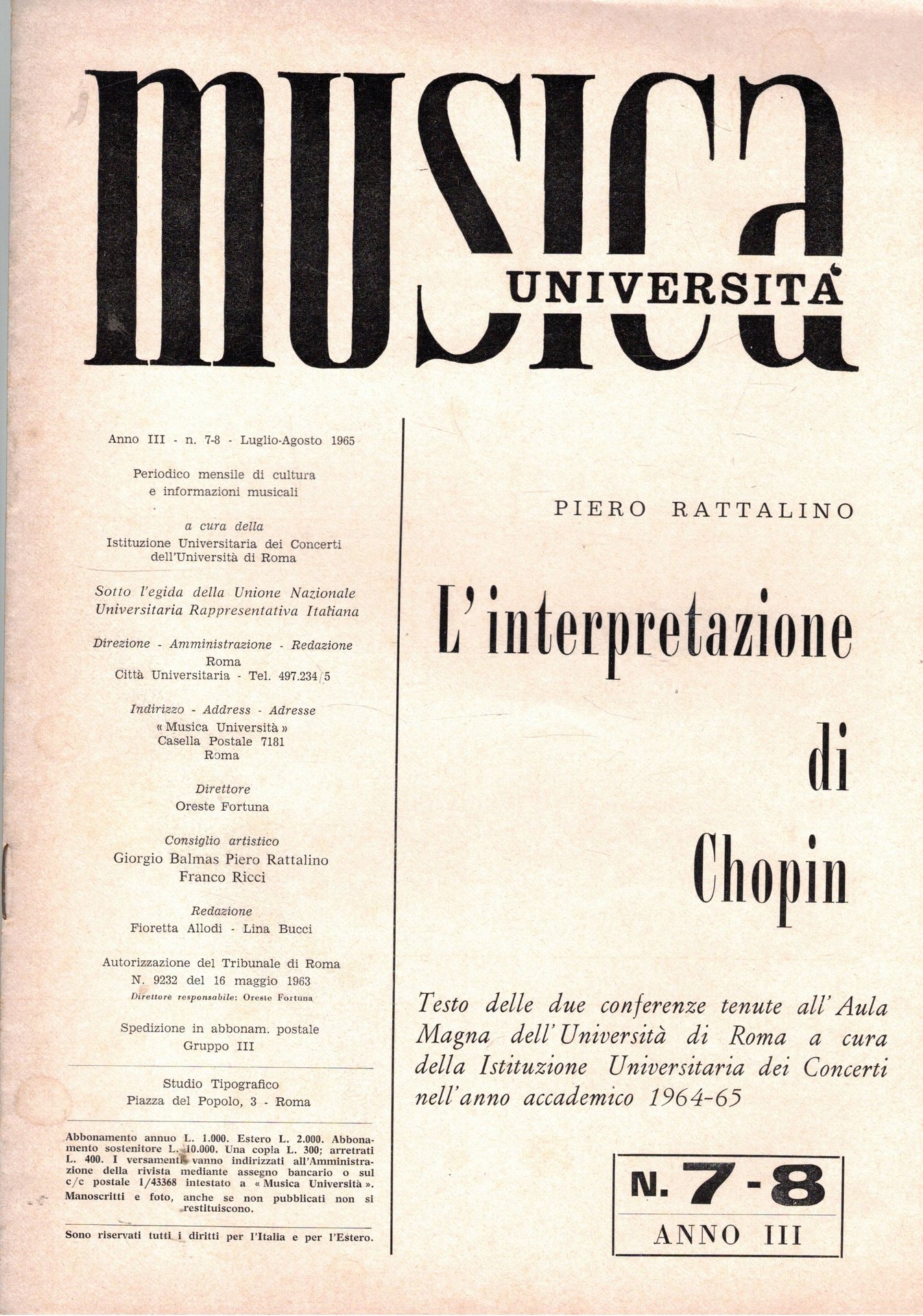 Musica Università, periodico a cura della università dei concerti dell'univ. di Roma anno III n° 7-8 lug-ago. 1965: di Pietro Rattalino l'interpretazione di Chopin. Testo delle due conferene tenute nell'aula magna dell'univ. di Roma.