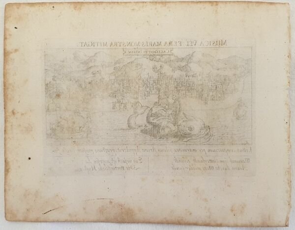 Bella veduta seicentesca della città di Calcutta in India tratta dall'opera Sciagraphia Cosmica nota anche con il titolo "Das ist Newes Emblematisches Buechlei, dainen in acht Centurijs die vornembste Stat, Vestung, Schlosser der ganzen Welt". Mostro marino cavalcato da un arpista e imbarcazioni. Motto "Musica vel fera maris monstra mitigat" La musica calma perfino i mostri marini. La Sciagraphia Cosmica, venne ampliata sotto la supervisione di Kieser dopo la morte di Meisner nel 1625, arrivando quindi ad una composizione di 800 magnifiche incisioni.Ogni opera è caratterizzata da un motto sopra l'immagine, e da versi emblematici (in latino o tedesco). L'opera è la combinazione di due generi allora popolari, il libro degli stemmi e il "Teatro delle città". Tra i maestri incisori e miniatori che contribuirono a questa serie ci sono Matthäus Merian, Sebastian Furck, Christian Stimmer e forse anche Meisner stesso, che concepì l'opera e contribuì a buona parte della prosa. (Cfr. Cremonini pag. 54/58, 45a). In buone condizioni Data: XVII secolo Tecnica: acquaforte Dimensione del foglio: 16x20 cm Dimensione incisione: 10x15 cm Condizioni: Buone. Alcune fioriture. Beautiful view of 17th century of Kolkata city in India from the work Sciagraphia Cosmica also known with the title of "Das ist Newes Emblematisches Buechlei, dainen in acht Centurijs die vornembste Stat, Vestung, Schlosser der ganzen Welt". Sea Monster with an arpist and boats. Saying "Musica vel fera maris monstra mitigat" Music relaxes even sea monsters.The Sciagraphia Cosmica, was enlarged under the vision of Kieser after the death of Meisner in 1625, getitng to a composition of 800 very beautiful views.Each work has acarchterized by a saying above the engraving, and of verses in latin and german. Between the engravers and illustrator there are Matthäus Merian, Sebastian Furck, Christian Stimmer and perhaps also Meisner who created the work and contrinbuited to a part of the prose. (Cfr. Cremonini pag. 54/58, 45a). In good conditions Date: 17th century Technique: Etching Leaf Dimension: 16x20 cm Engraving Dimension: 10x15 cm Conditions: Good conditions. Some foxing.