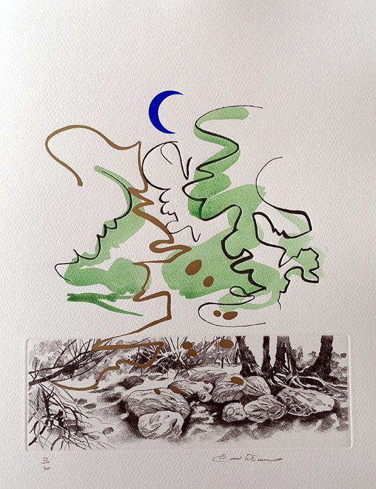 4°; pp. non num. 36 a quartini sciolti, su carta a mano filigranata appositamente fabbricata. Un poemetto di Remigio Bertolino interpretato da sette acqueforti ed interventi artistici della Terreno, tutti f.testo firmati e numerati a matita, con tocchi ad acquerello ed interventi con impressione a caldo in oro o argento. Camicia con piatto decorato, custodia t.tela edit. con titoli al piatto. Bella edizione limitata a soli 38 esempl. numerati, firme del poeta e dell'artista al colophon.<BR>(vedi riproduz.)
