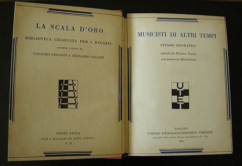 In 16? (cm 18), , pagg. Legatura edit. mezza tela, pagg. 188-(4) con XXII tavole b.n. e a colori f.t., belle testatine e finalini, segni del tempo alla cop., buon es. Collana "La scala d'oro. Biblioteca graduata per ragazzi" concepita e diretta da Vincenzo Ferrante e Fernando Palazzi, serie sesta, per i ragazzi di anni undici, n. 19. Vite di misicisti da Giovanni Pierluigi da Palestrina a Mozart con un prologo sulla storia della musica
