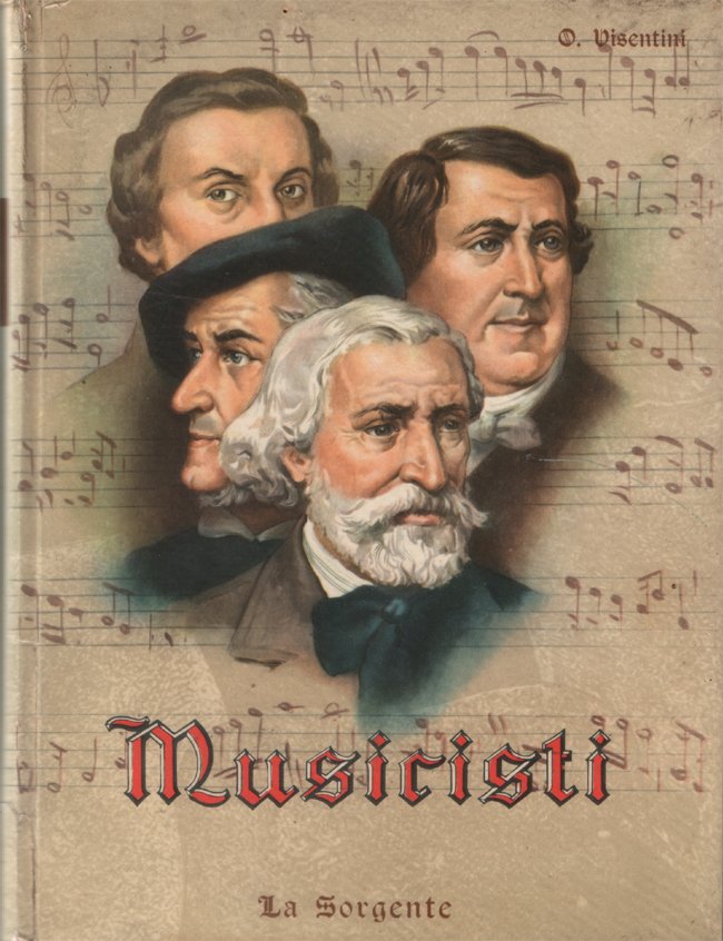 In-8°, pp. 293, (3), legatura editoriale illustrata a colori. Una piccola rottura, senza perdite nella parte inferiore del dorso e delle cerniere, molto ben riparata da intervento di restauro. Con 13 tavole a colori fuori testo e 21 figure nel testo del pittore A. Mairani. Firma di appartenenza al frontespizio. Un minuscolo foro (1 millimetro di diametro) e due piccoli, leggeri aloni nel margine destro del frontespizio; leggeri segni d'umido alle guardie e ai tagli. Per il resto, in buono stato. Indice: Il libro della grazia alata (Preludio); Il violinista del Re (Gian Battista Lulli); Il "Cantor" (Sebastiano Bach); Il "Sassone", (Giorgio Federico Haendel); Il viandante (Giuseppe Haydn); Il fanciullo prodigioso (Wolfango Amedeo Mozart); Il "Solitario" (Ludovico Beethoven); Il musicista zingaresco (Franz Schubert); Il vagabondo (Nicolò Paganini); Il musicista felice (Gioacchino Rossini); Il grande infelice (Gaetano Donizetti); Il Catanese (Vincenzo Bellini); Il musicista poeta (Federico Chopin); Il maestro del Risorgimento (Giuseppe Verdi); L'esule immortale (Riccardo Wagner); L'uomo delle visioni (Carlo Gounoud); Il ventunesimo figlio (Giulio Massenet); Uno dei "Cinque" (Modesto Mussorgsky); Il sognatore dei fiordi (Edoardo Grieg); Il cacciatore di melodie (Giacomo Puccini); Il Livornese (Pietro Mascagni).