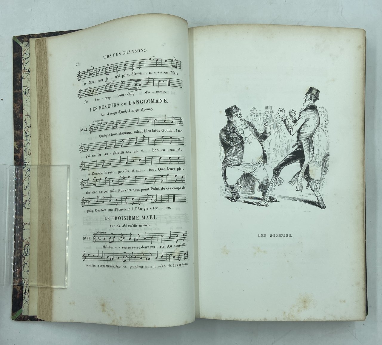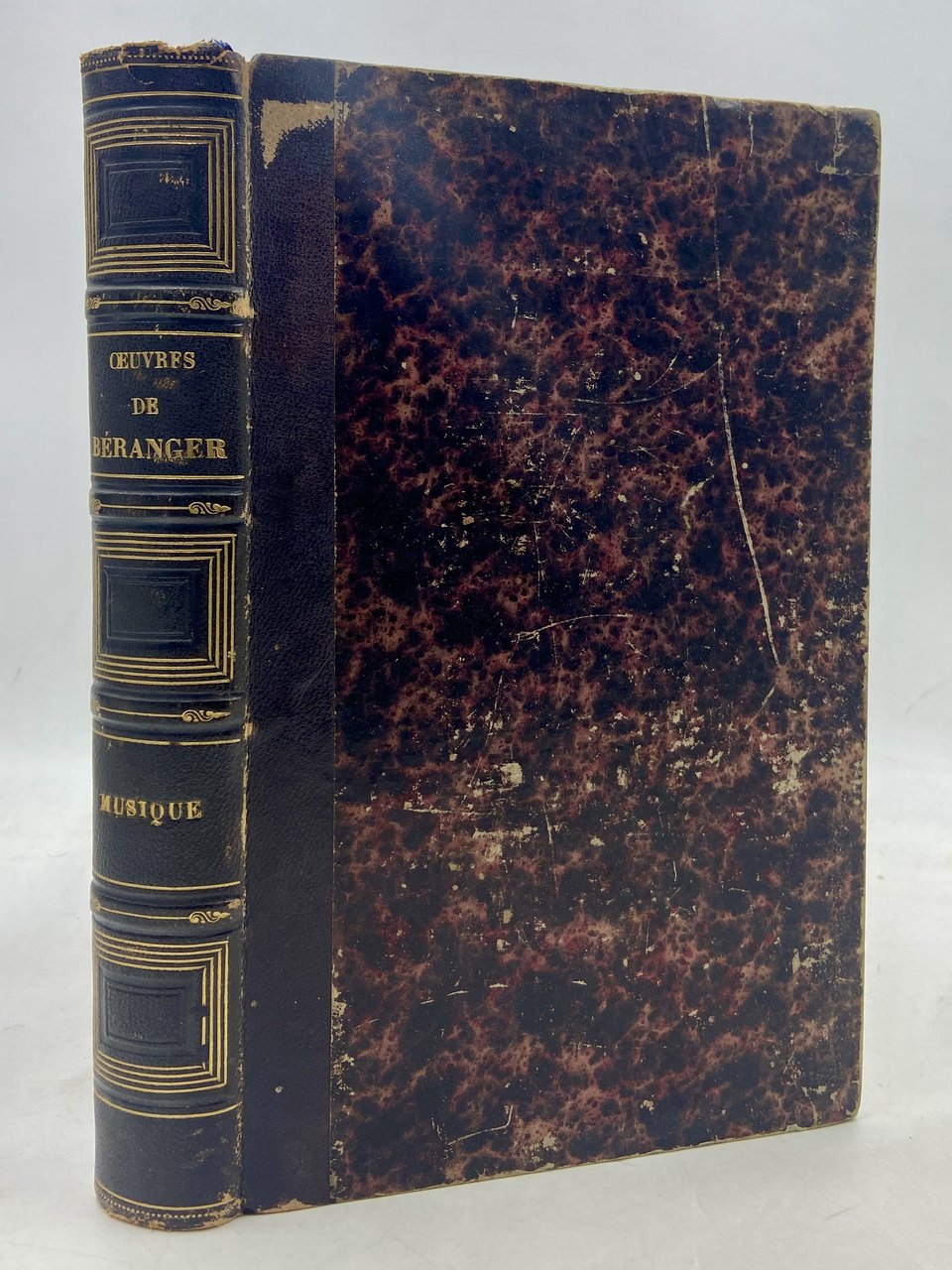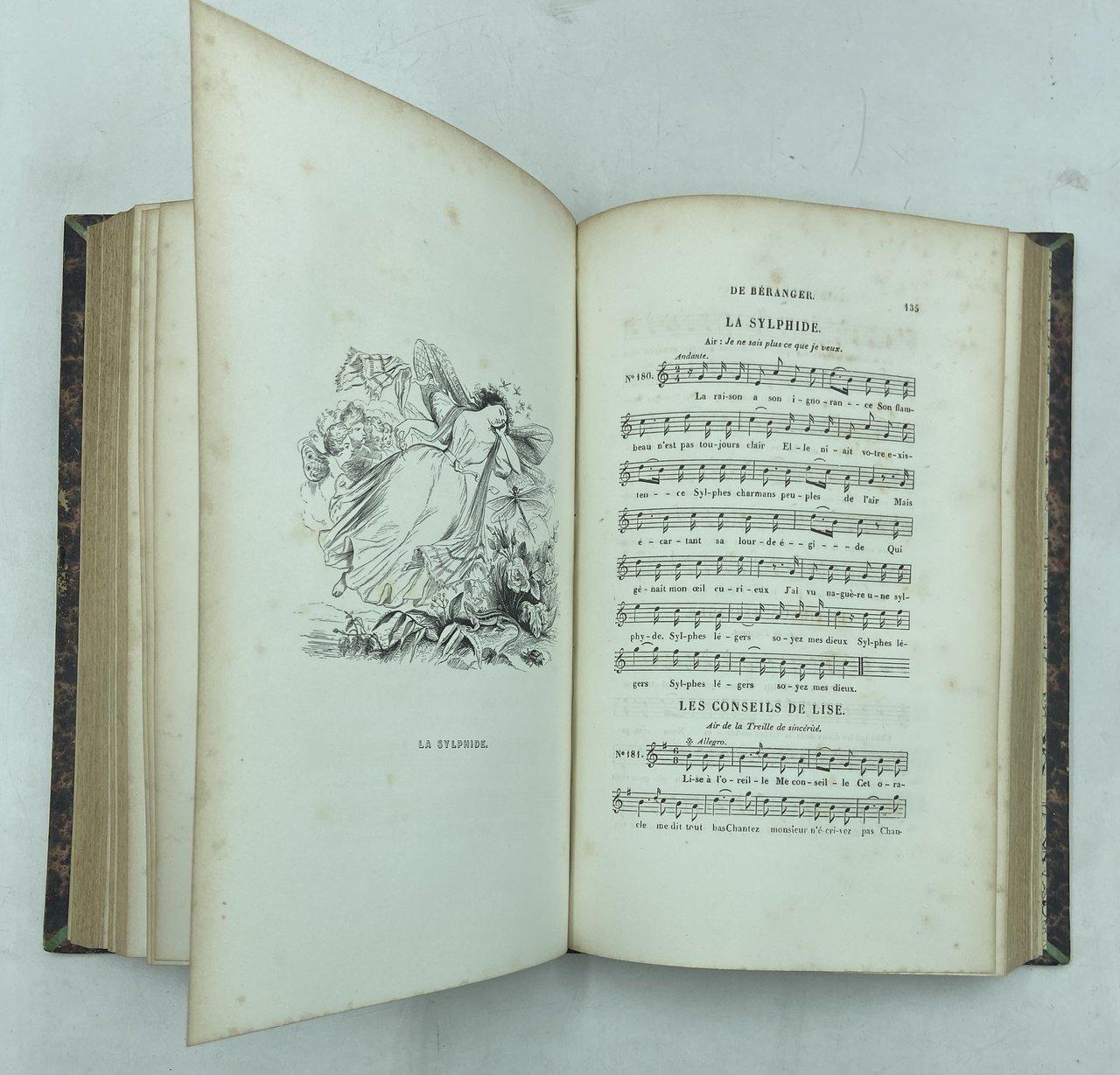 Legatura ottocentesca in mezza pelle (piccoli difetti su cuffie e coperta), in ottavo cm 24 x 15.5, pp 292, vignetta sul frontespizio, 84 tavole incise incluso il ritratto all'antiporta e il frontespizio figurato per l'Album. Nota di proprietà sulla prima sguardia, qualche fioritura, tracce d'uso sulla legatura. Quarta edizione, aumentata della musica per le nuove chansons e di tre arie con accordi per pianoforte di M. Halvey e M.me Mainvielle-Fodor, di questa raccolta di canzoni del popolare poeta francese, col testo accompagnato da spartiti. Questo esemplare è legato con le tavole dell'Album Béranger di Grandville che, intercalate ai testi, illustrano con perfetto contrappunto i soggetti licenziosi, satirici, e politici delle canzoni. Grandville (Jean-Ignace-Isidore Gérard, Nancy 1803 - Vanves 1847) aveva illustrato l'edizione 1836 delle opere di Béranger con una suite di incisioni (Carteret, p. 82); una selezione di 84 di queste tavole fu ristampata da Perrotin per accompagnare la quarta edizione delle canzoni musicate, che si vendeva «avec ou sans la suite» (Carteret). Le canzoni di Béranger, spesso di denuncia politica e anticlericale, conobbero uno straordinario successo rendendolo il più celebre poeta dell'epoca, apprezzato da contemporanei come Goethe e Hugo. Bibliografia: Carteret, Le Trésor du Bibliophile Époque Romantique, p. 85.