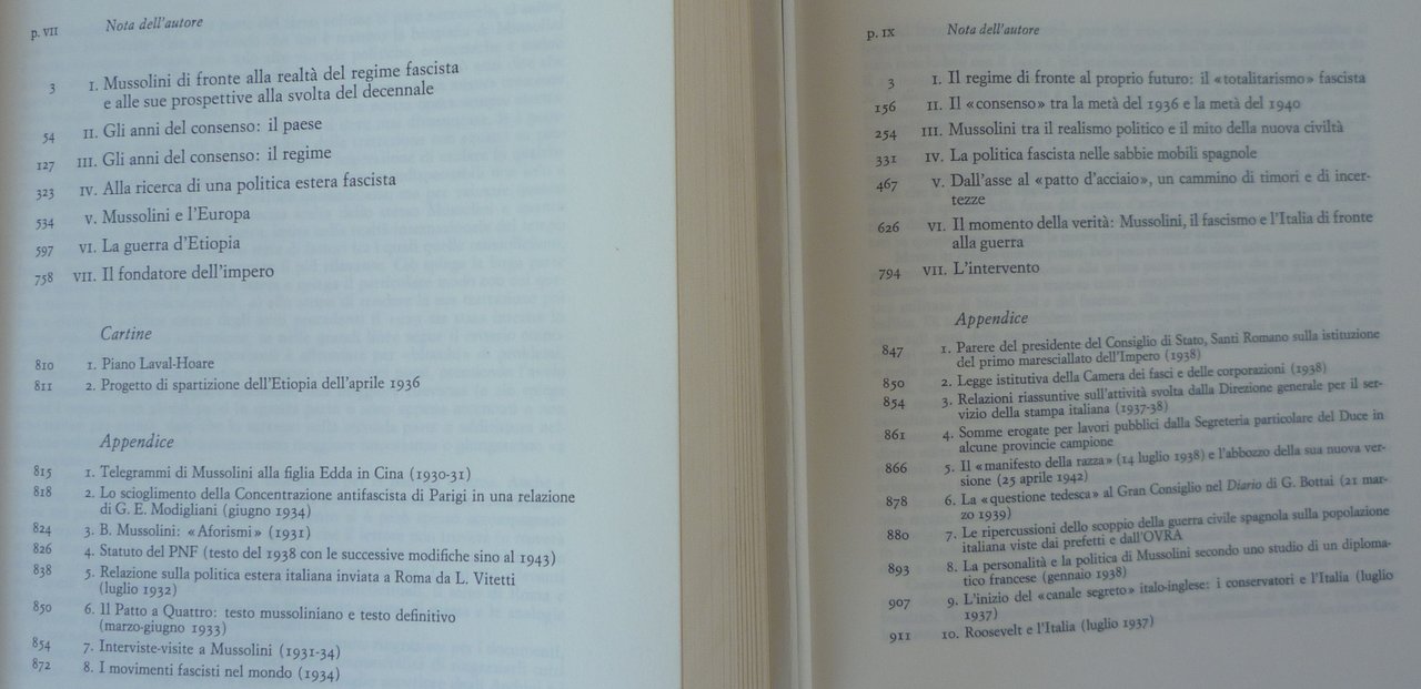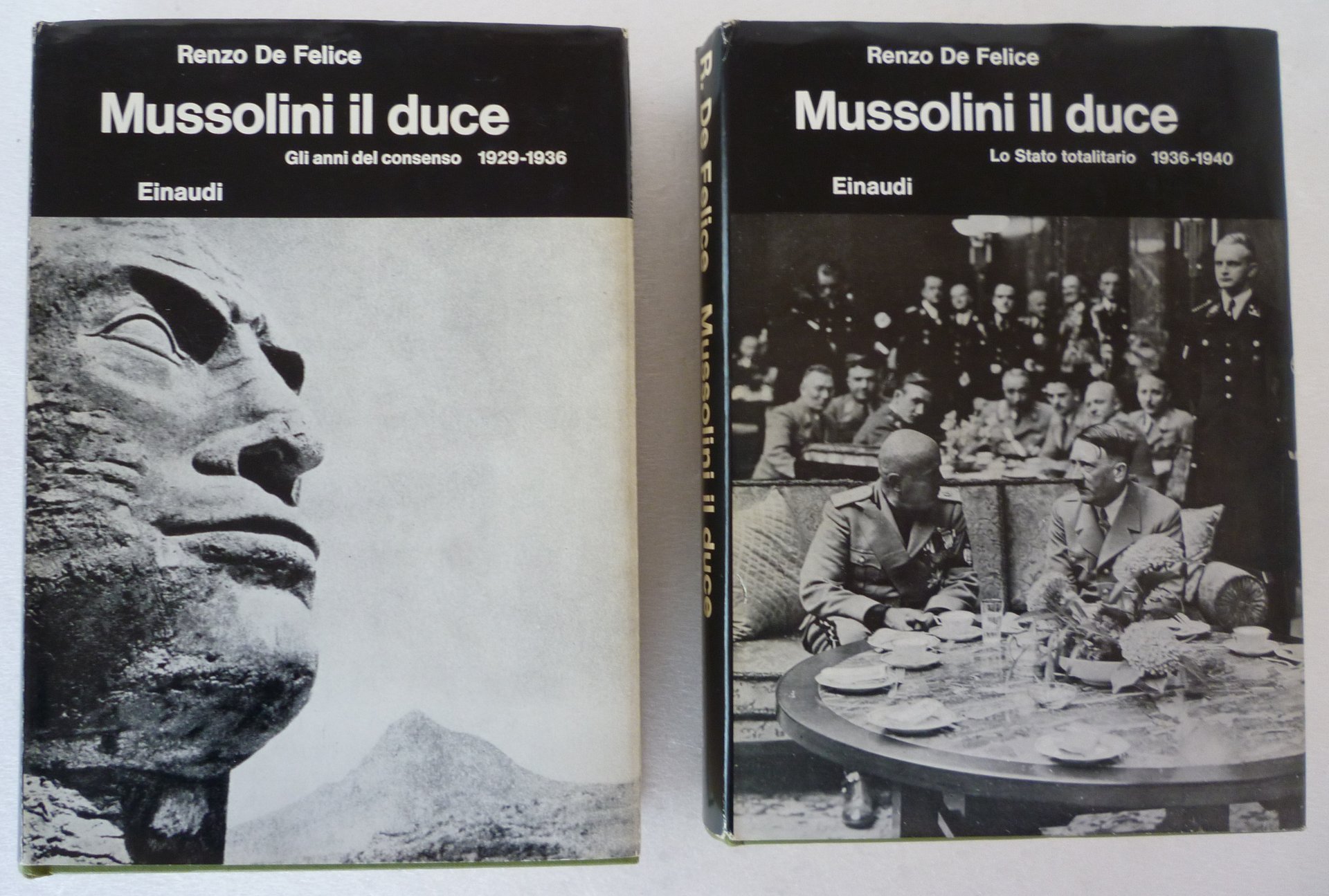 2 volumi (mm.215x170), pagg.949; pagg.944. Legature rigide editoriali con sovraccoperta fotografica. Esemplare allo stato di nuovo, mai sfogliato. Primo volume: Gli anni del consenso 1929-1936; Secondo volume: Lo Stato totalitario 1936-1940.