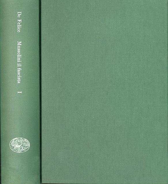 4. ed., rist. 806 p. ; 21 x 15 cm. Biblioteca di cultura storica, 92/1. Uscito nel 1966, questo primo tomo del volume "Mussolini il fascista" conferma l'impostazione della monumentale biografia del dittatore italiano scritta dallo storico Renzo De Felice (1929-1996). La ricerca allarga l'indagine storiografica dal personaggio Mussolini al fenomeno del fascismo, indagato sia come organizzazione sia come partito al potere. Assistiamo al dilagare delle lotte agrarie e alla costituzione dei «blocchi nazionali», all'effimero «patto di pacificazione» del 1921, al precipitare della crisi: la marcia su Roma, la legge elettorale maggioritaria, le elezioni del 1924, il delitto Matteotti, sino al discorso del 3 gennaio 1925 che segna l'inizio della dittatura. In appendice il programma agrario fascista del 1921, il programma del PNF, il verbale della prima riunione del governo Mussolini, il discorso del 1924 e lo schema completo degli incarichi statali e governativi dal 1922 al 1925. Legatura editoriale, coperta in cartone rigido telato di colore verde, titolo impresso in bianco al dorso, muto il piatto. Manca la sovraccoperta originale, qualche segno del tempo alla coperta, per il resto esemplare integro. Codice libreria 7775.