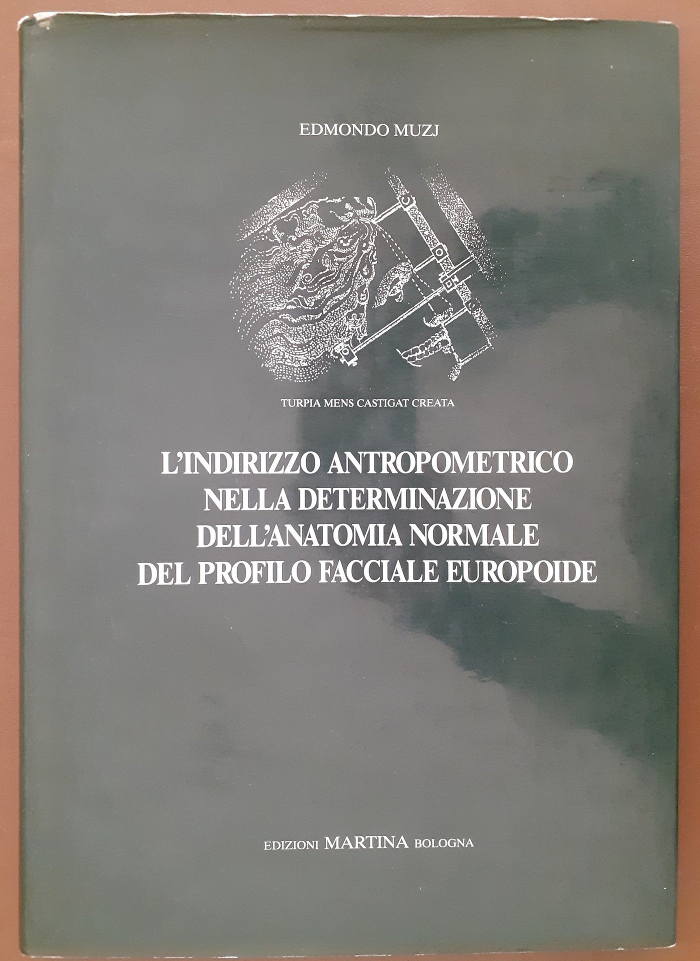 Edoardo Muzj, L’indirizzo antropometrico nella determinazione dell’anatomia normale del profilo facciale europoide, Edizioni Martina, Bologna 1993, seconda ed. riveduta e ampliata, pp. 204, ill. b.n., cm 30, legatura in tutta tela ed. blu con titoli in oro al dorso e al piatto e sovraccoperta. Al piatto posteriore, residuo di etichetta adesiva con prezzo. Leggere tracce d’uso alla sovraccoperta, minima brunitura della carta, per il resto ben conservato.