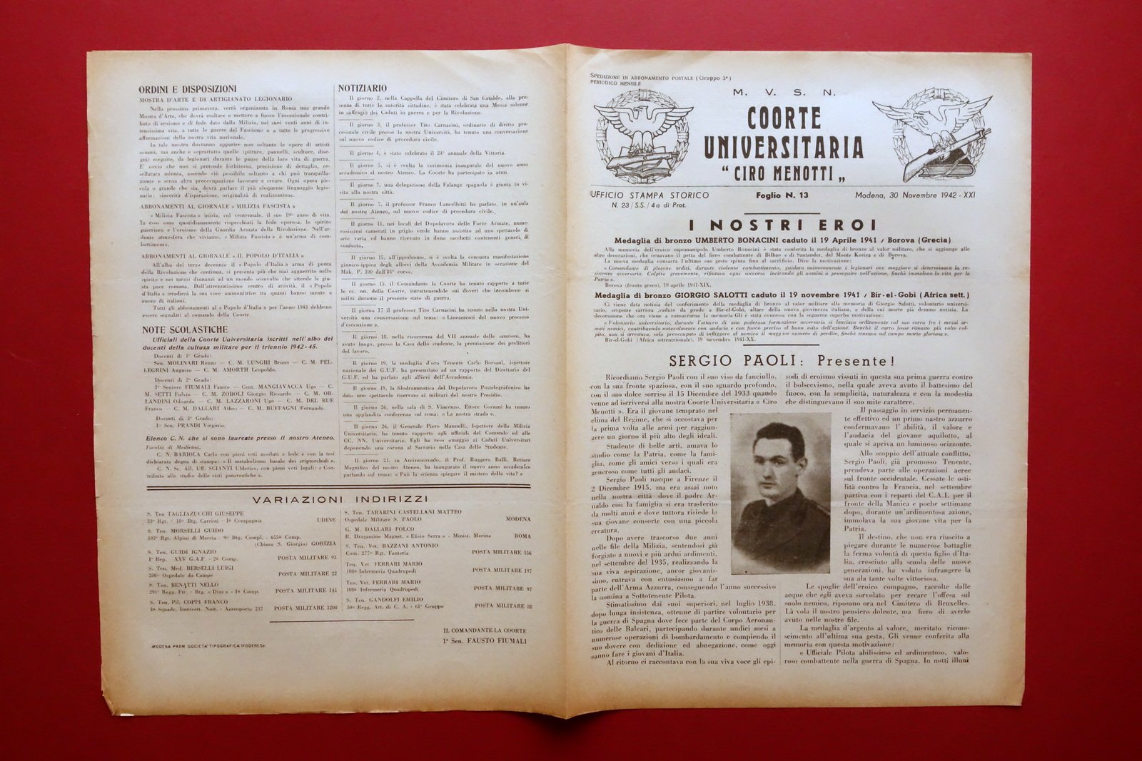 Rivista, M.V.S.N. Coorte Universitaria Ciro Menotti" Foglio numero 13 Modena, 30 novembre 1942 Soc. Tipografica Modenese, Modena 1942; cm 35x25; pp. non num. (bifolio di pp. 4). Numero completo. Condizioni di conservazione Esemplare in buone condizioni con leggere tracce di utilizzo, lievi marginali accenni di ingiallimento dovuti al tipo di carta; angoli con minuscoli difetti. Poche minuscole bruniture. Numero completo. Alla prima pagina articolo su Sergio Paoli. In apertura due brevi comunicati sui caduti Umberto Bonacini (Grecia) e Giorgio Salotti (Africa Settentrionale), entrambi insigniti della medaglia di bronzo. SC03.D18633 N F "