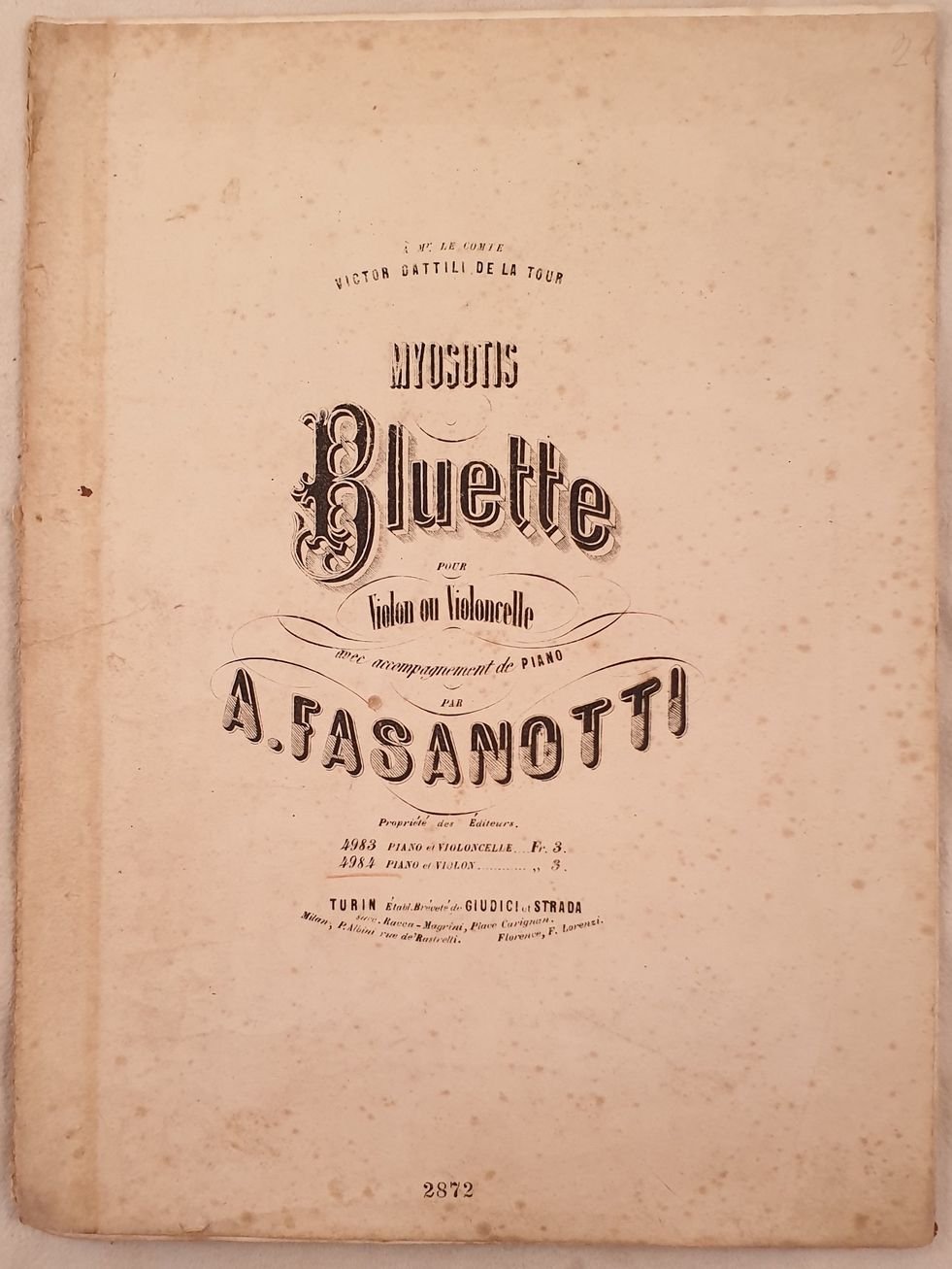 Spartito musicale del 1880 circa della melodia "Myosotis"del compositore A. Fasanotti. Partitura per violino o violoncello con accompagnamento di pianoforte. In buone condizioni. Brossura editoriale in discrete condizioni generali con usure e strappi ai margini e dorso. Legatura assente. All'interno le pagine si presentano in buone condizioni con fioriture. In 4. Dim. 34x27 cm. Pp. 3+7.musical score of 1880 circa of the melody "Myosotis" by the composer A. Fasanotti. Muscial score for violin or violoncello with accompainement of piano. In good conditions. Editorial cover in fair general conditions with wearings and tears in the edges and spine. Binding is missing. Inside pages are in good conditions with foxings. In 4. Dim. 34x27 cm. Pp. 3+7.