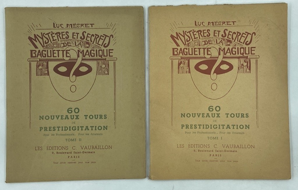 Opera completa in due volumi in brossura editoriale illustrata, cm 24 x 19, pp 51 (1), 51 (1) con numerose illustrazioni in nero. Testo in francese. Edizione originale (stampa settembre 1948) di questa raccolta di 60 illusioni e trucchi di magia rivolti a prestigiatori professionisti e dilettanti. Luc Mégret, «Magicien français et vulgarisateur de la magie» (Raczynski) esordì come illustratore negli anni '20, affiancando ai lavori per almanacchi, romanzi popolari e album per l'infanzia una produzione di immagini e affiches per illusionisti e prestigiatori, guadagnandosi la nomea di «dessinateur du mystère». Mégret fu inoltre prolifico autore di propri manuali di magia di taglio popolare, di cui curò naturalmente anche la parte iconografica, ristampati fino agli anni '70.