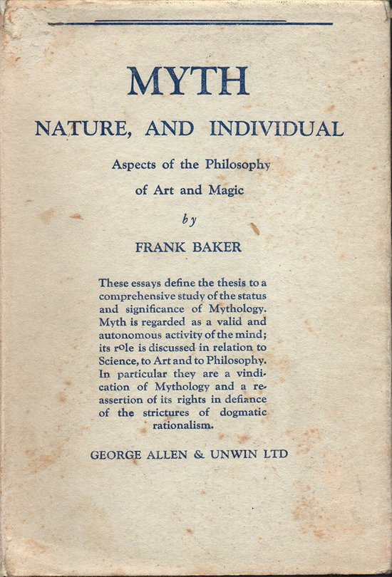 In-16° (18,2 x 12,2 cm), pp. 135, (1), legatura editoriale in tela con sovraccoperta. Tracce d'uso e del tempo alla sovraccoperta, in particolare: piccoli segni d'umido; qualche menda e alcuni strappetti ai margini, questi ultimi ben rimarginati con carta giapponese applicata nella parte interna; lieve brunitura alla parte che copre il dorso del volume. Pochi, leggeri segni d'umido anche alla legatura, al taglio davanti, alle prime pagine e all'ultima. Al recto della carta di guardia anteriore e al verso di quella posteriore, nella parte interna non a contatto con le alette della sovraccoperta, leggerissimo alone color beige, di perfetta forma rettangolare, che si sviluppa in senso verticale rispetto alla pagina, della larghezza di 3,9 cm per 18,2 cm di altezza, probabilmente determinato, nel tempo, dalla reazione al contatto con le controguardie, fissate, in sede editoriale, con materiale adesivo ai contropiatti. Normale patina del tempo alle pagine, per il resto, ben conservato. Dalla sovraccoperta: «These essays define the thesis to a comprehensive study of the status and significance of Mythology. Myth is regarded as a valid and autonomous activity of the mind; its role is discussed in relation to Science, to Art and to Philosophy. In particular they are a vindication of Mythology and a reassertion of its rights in defiance of the strictures of dogmatic rationalism». Part I. Analysis of Contents I. Introduction. Life and Purpose (The Status of Teleology.) Teleology as makeshift or bastard category. The inadequacy of Teleology to the problems of Eternity. Teleology in Platonic thought. Teleology in Iconoclastic Monotheism (Spinoza), Nietzsche and Teleology. Teleology and society. Teleology in the Philosophy of Schopenhauer. II. The Eternal and the Purposive aspects of Art. Prometheus as Eternal Artist. The Promethean aspect of Art as mirrored in the Heroic Myths. III. The Purposive aspects of Art (continued). Art in the service of Life. Teleological basis of primitive rites. IV. Myth, Religion, and the Origin of the Drama. Interrelations of the Purposive and the Eternal aspects of Art. Contingency of the category of Purpose as applied to Life and Art. V. Magic as the Teleology of Myth. Myth in the service of life. The Relativity of all Formulations. The Pragmatic sanction for Magic. VI. The Teleology of Cannibalism and the relation therein of Myth to Magic. Cannibalism and the Solar and Manistic Cults. VII. Teleology of Cannibalism (continued). The Significance of Pain in relation to the Origin of the Beautiful. Art as a "Marriage of Heaven and Hell". Dionysian and Apollinian States. Pain integral to Life. VIII. Reinterpretation of the significance of the Eternal and the Purposive aspects of Art, as the relation of Myth to Organism. Relation of the Artist to Nature. The meaning of Movement as bond between Artist and Nature. Characteristics of Organism elucidated. Rejuvenescence, Symbiosis, Polarity. IX. Final interpretation of the significance and Teleology of Cannibalism. The Common basis of Cannibal and Phallic rites. The transvaluation of values and the metamorphosis of Symbols. Sublimation and the trasformation of vital emphasis. X. Conclusion. Consciousness and Tragedy correlative terms. Intellectual Harmony and Vital Harmony. The Eternal and the Purposive aspects of Reality. The Irreducible antitheses. The Significance of the transition from the Animistic to the Manistic state. Tragic Myth as the epitome of Conscious Life. Part II. Analysis of Contents The Myth of Reality and the Reality of Myth: the Status and Significance of Mythology. Section I. Myth, Science and Consciousness. A. Fact and Phantasy. B. Dream Life and Waking Life. C. Space, Time, and Reality. Section II. Æsthetics, Mythology and Metaphysics. A. TheÆsthetics of Creation. B. Music and Image (i). Music and Image (ii). C. The Antinomy of the Real.