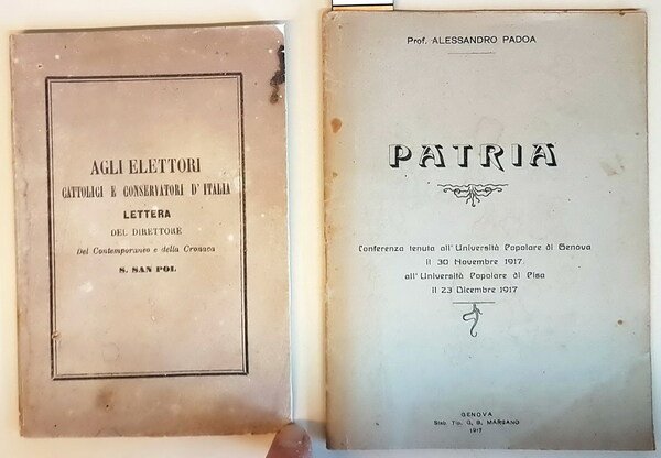 N. 2 opuscoli: AGLI ELETTORI CATTOLICI E CONSERVATORI D'ITALIA (lettera del Direttore del Contemporaneo e della Cronaca S. San Pol) - PATRIA (Conferenza tenuta all'Università Popolare di Genova il 30 novembre 1917 e all'Università Popolare di Pisa il 23 dicembre 1917)