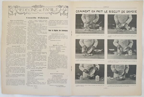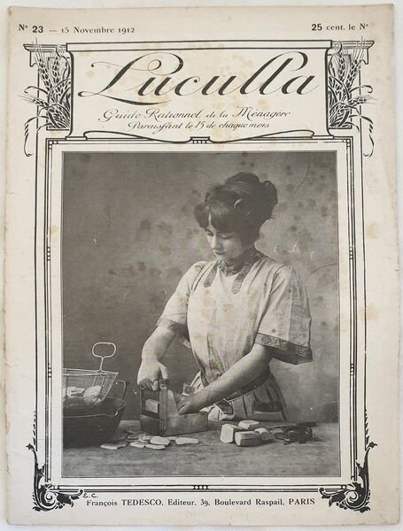 Numero del 15 novembre 1912 di questa rivista gastronomica francese "Luculla". All'interno: lista dei negozi di alimentari, tantissime ricette salate e dolci (patate Alonzo, Uova Missette, Canape, Sardine salsa mostarda, Anguilla, Filetti di sogliola Marguery, Entrecote alla marsigliese, Sella d'agnello ai legumi, Rognoni di montone allo champagne, pollo, coniglio solognote, fagiano al salmi, souffle alle patate, patate Allerton, riso all'inglese, flan al latte, omelette inglese) ricetta fotografica dei boscotti Savoia, , fragole, ricette per gli anemici ecc. Numerose illustrazioni e foto d'epoca, pubblicita d'epoca. Copertina editoriale in discrete condizioni con usure ai margini e dorso. Strappo orizzontale. Legatura in buone condizioni. Pagine in buone condizioni con fioriture. In 4. cm. 31x23. Pp. da 201 a 220+(4). Number of the 15th of november 1912 of this french gastronomic magazine "Luculla". Inside: list of food shop, many recipes also of sweets (patate Alonzo, Uova Missette, Canape, Sardine salsa mostarda, Anguilla, Filetti di sogliola Marguery, Entrecote alla marsigliese, Sella d'agnello ai legumi, Rognoni di montone allo champagne, pollo, coniglio solognote, fagiano al salmi, souffle alle patate, patate Allerton, riso all'inglese, flan al latte, omelette inglese) photographed recipe of Sovoy biscuit, recipes for anemic ecc. Different illustrations and photos, advertisings. Editorial cover in fair conditions lightly worn in the extremities. Horizontal tear. Binding in good conditions. Pages in good conditions with foxing. In 4. cm. 30,5x23. Pp.from 201 to 220+(4).