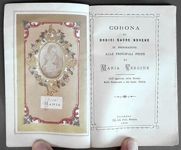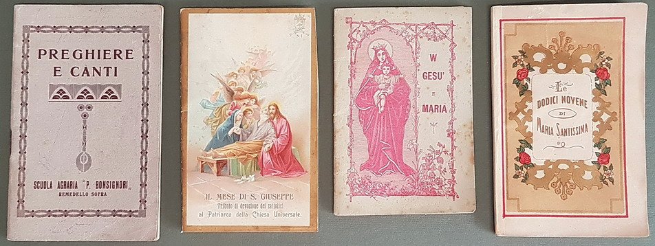 Edizione: descrizioni dei volumi: 1) le dodici novene di maria santissima in preparazione alle principali feste di maria vergine (piacenza 1890) - tip. lit. frat. bertola (pp. 64 con 1 tav. cromolitografica a colori in antiporta) - 2) avvisi di un parroco di alcune pratiche di pieta' (ivrea 1886) - tip. tomatis (pp. 32, 1 tav. in nero in antiporta) - 3) il mese di s. giuseppe tributo di venerazione dei cattolici al gran patriarca della chiesa cattolica universale (reggio emilia 1902) - societa' poligrafica cattolica editrice (pp. 48) - 4) preghiere e canti (s.d. 1900) - scuola agraria p. bonsignori (pp. 40).