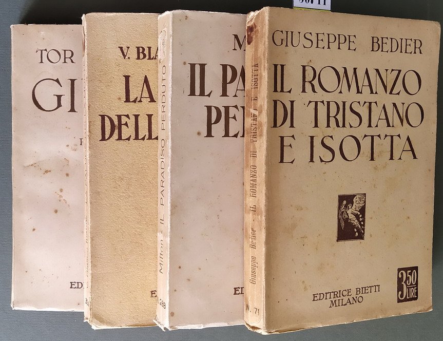 Edizione: n. 4 volumi della collana: biblioteca reclame, cos㬠descritti: 1) giuda storia di una sofferenza (tor hedberg), pag. ix, (1), 270 - traduzione di alessandro koltonski (vol. n. 72 del 1932) - 2) il romanzo di tristano e isotta (giuseppe bedier), pag. 296, (1) - traduzione di francesco picco (vol. n. 71 del 1932) - 3) il paradiso perduto (milton), pag. 405, (3) - versione di lazzaro lapi (vol. 288 del 1932) - 4) la palude della morte (v. blasco ibanez), pag. 236, (4) - traduzione di a. salucci (vol. n. 324 del 1938).