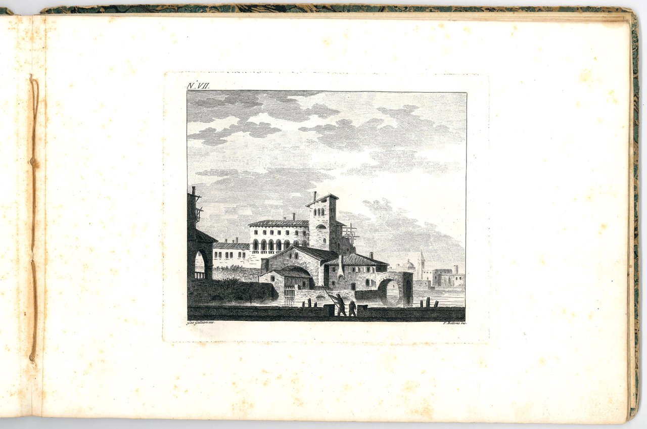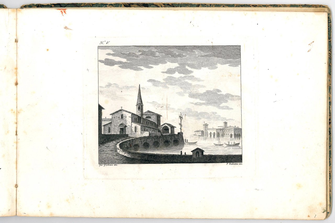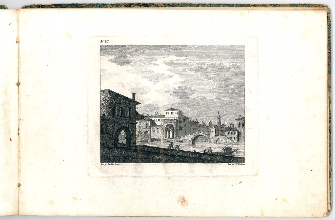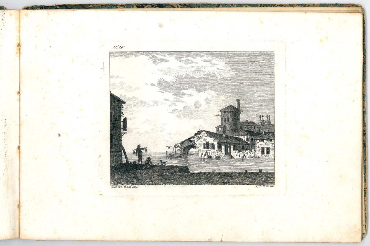 Unrecored album of 12 etchings showing city views set in lagoon, river or lake landscapes, with bridges, arches and vaults, and imaginary cities composed of ancient buildings, in a style that seems to combine those of Canaletto and Piranesi. The first plate contains the title of the suite inscribed in a tombstone.