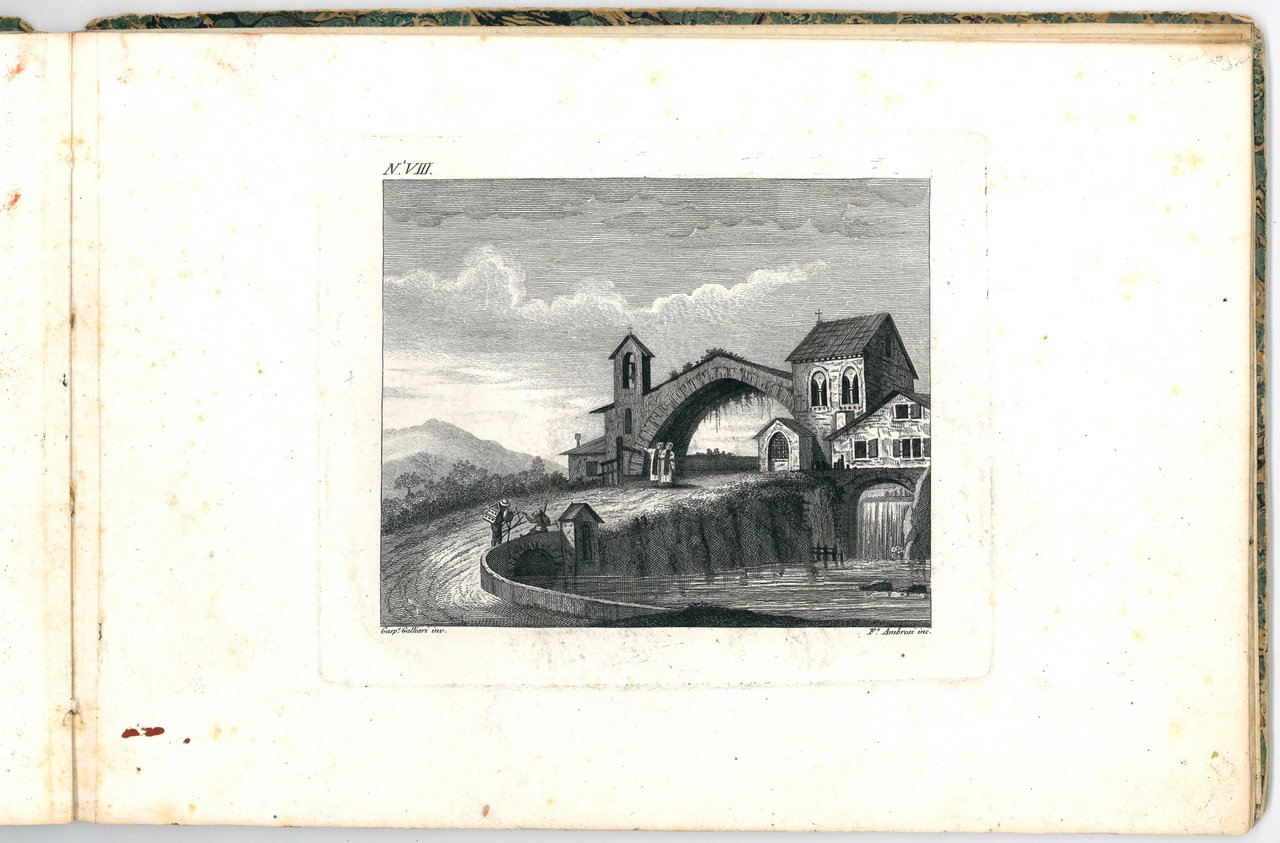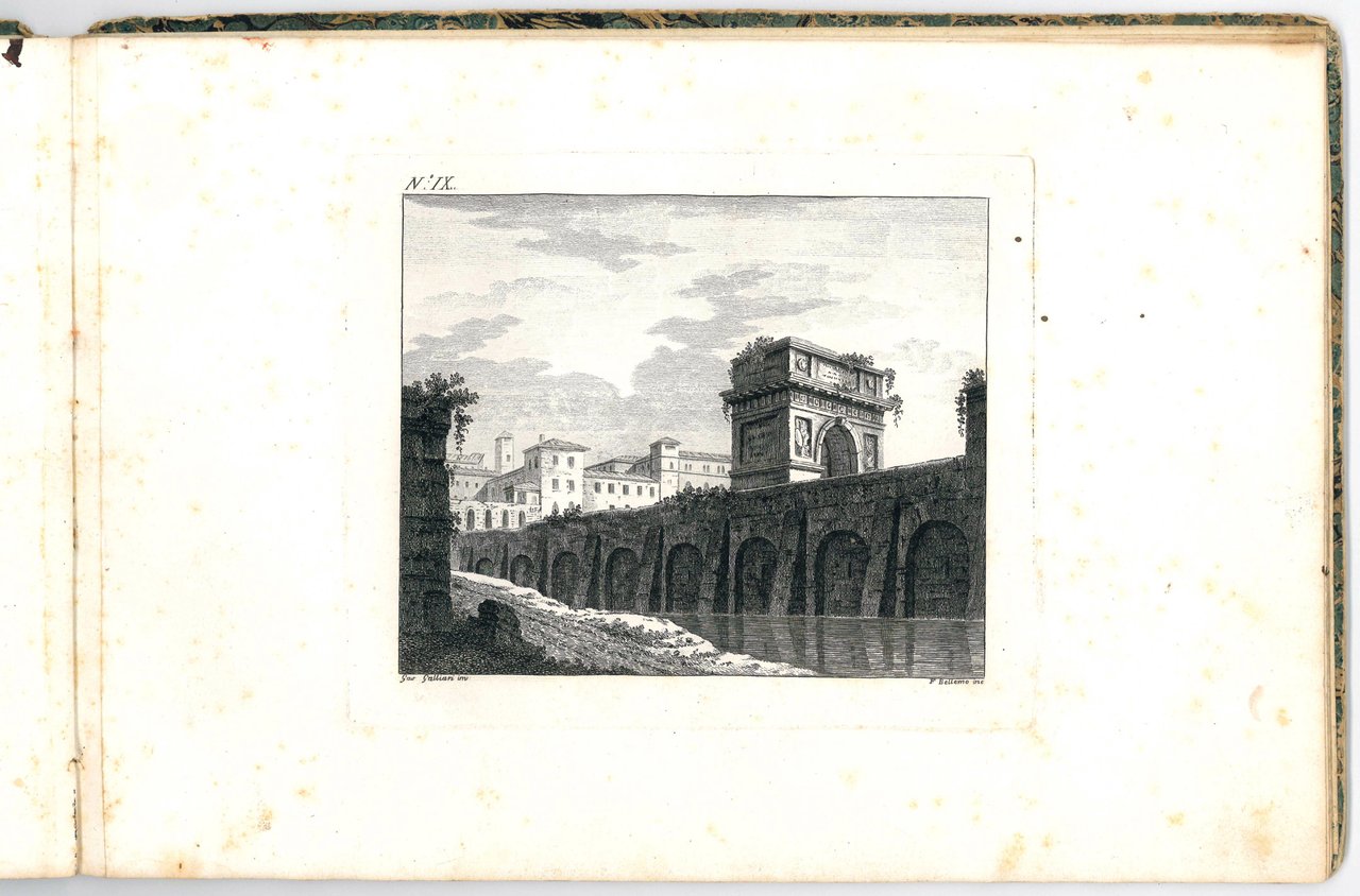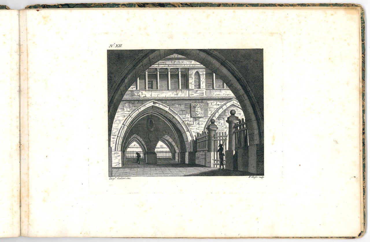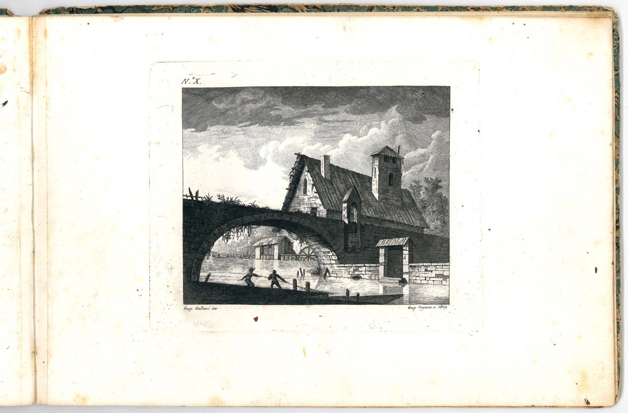 Unrecored album of 12 etchings showing city views set in lagoon, river or lake landscapes, with bridges, arches and vaults, and imaginary cities composed of ancient buildings, in a style that seems to combine those of Canaletto and Piranesi. The first plate contains the title of the suite inscribed in a tombstone.