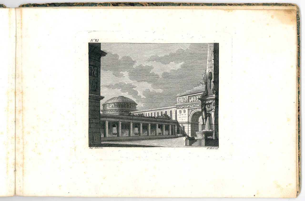 Oblong folio (225x335 mm). 12 numbered etched plates (c. 155x190 mm) printed on the recto of as many leaves, including the title page. The plates are all signed by Galliari as designer and by three different engravers: Francesco Bellemo, Francesco Ambrosi and Gaspare Cagnoni. Contemporary marbled boards (rubbed and worn). Light marginal staining and foxing, but a very good, genuine copy.