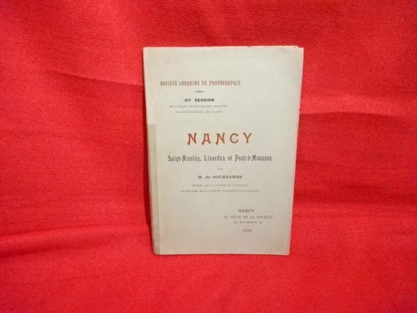 Nancy, Au siège de la Société, 1898; in-8 (120 x 173 mm), 38 pp. + 8 pl. et un plan dépliant hors-texte, broché (dos de couverture restauré avec du film adhésif). Société Lorraine de Photographie. - VIIème session de l'Union Nationale des Sociétés Photographiques de France. L'auteur est membre de l'Académie de Stanislas, secrétaire de la Société d'Archéologie Lorraine. Illustrations en noir et blanc (15 photographies et un plan de Nancy dépliant).