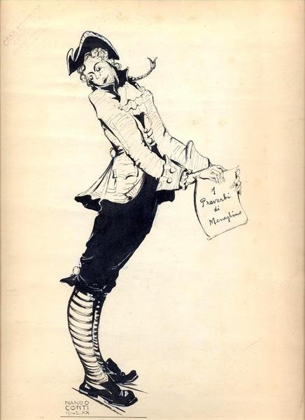 Nando Conti. Bozzetto a china firmato per la copertina del libro "I Proverbi di Meneghino" edito dalla Ceschina di Milano del 1942.