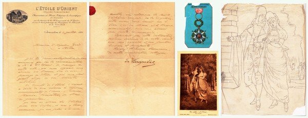 Comunicazione manoscritta dell'Etoile D'Orient per il conferimento all'artista della Stella d'Oriente datato Gerusalemmme, 5 Luglio 1898 di 2 facciate; bozzetto originale su lucido in formato 20,5X27,5 per la cartolina da lui illustrata "Un idillio" allegata