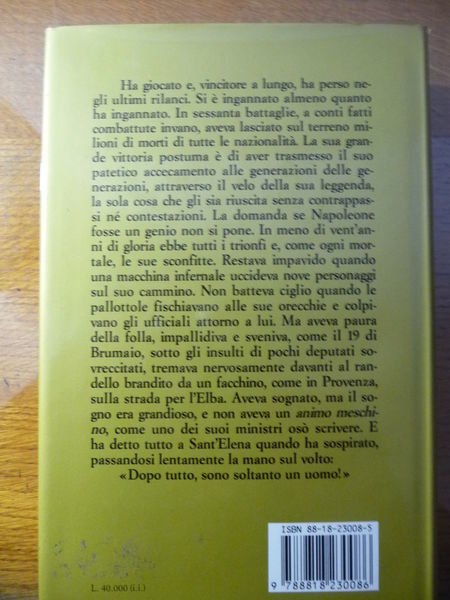 DESCRIZIONE: Ed. Rusconi, Milano, 1989. In 8°, leg. cart. rossa con tit. oro al dorso e sovracc. ill. a col., 455 pp. con 8 ill. b/n f.t., 1^ ediz. Con penetrante perspicacia Louis Chardigny predispone una sorta di schermo trasparente attraverso il quale spiccano il carattere, le predilezioni, i gusti, le manie e i segreti di un capo di Stato che, deificato in vita, è passato direttamente sul versante, sempre un po' retorico, della leggenda. Senza timori reverenziali, Chardigny toglie il personaggio dal piedistallo e punta tutta la sua attenzione di storico su un obiettivo: considerare Napoleone nella sua quotidianità, nei gesti di tutti i giorni, nei rapporti con gli altri. Indice: Patologia, carattere; Lavorare con Napoleone; Seduzioni e pericoli del potere solitario; In viaggio e in guerra; Da uomo a uomini; Napoleone e la famiglia, sua e degli altri; La politica e l'amore; La patria imperiale; Libertà amata; Trionfi e sconfitte della propaganda; Sono soltato un uomo; Note; Fonti; Notizia; Indice dei nomi. CONDIZIONI: Perfette. PESO / WEIGHT: 800 gr. without package