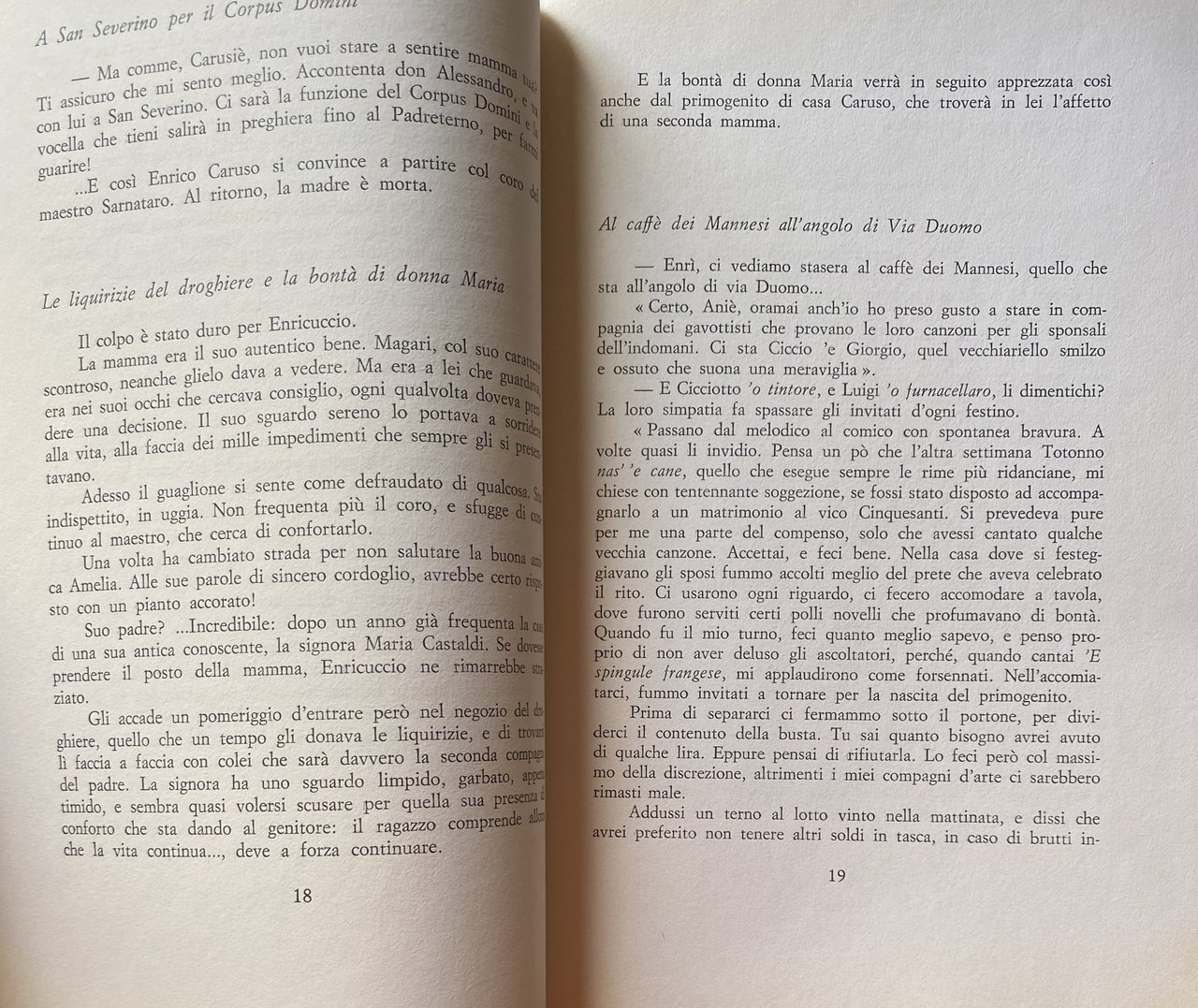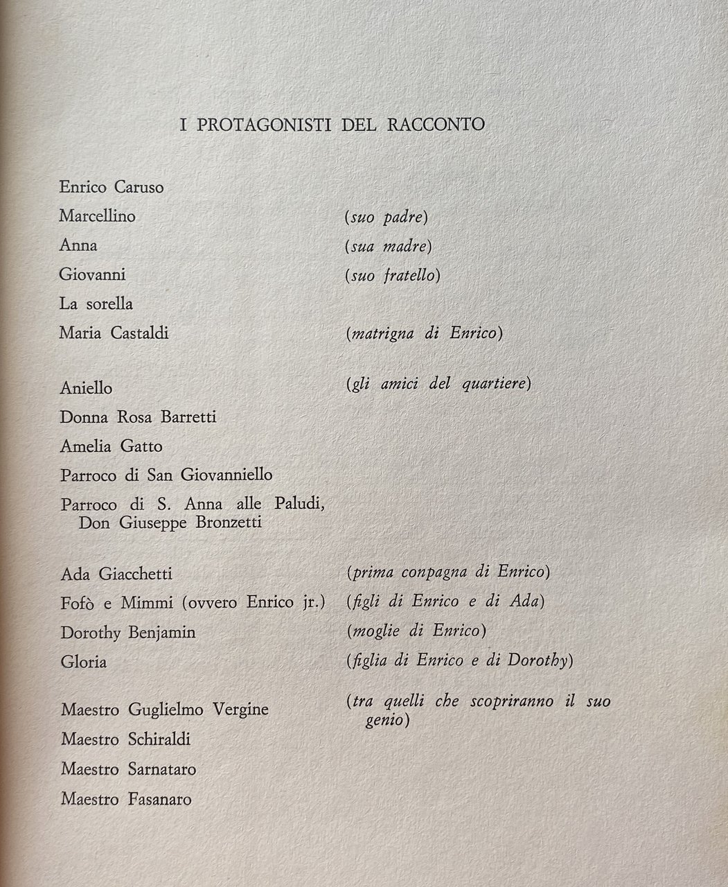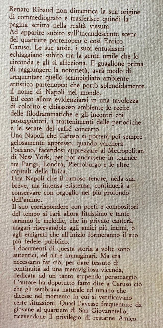 Non il rimpianto d'un epoca passata. Soltanto la cronaca sorniona e spumeggiante d'una città che rivive nel fantasioso racconto dei suoi protagonisti. Enrico Caruso, il grande tenore, fa da tramite all'intrecciarsi degli avvenimenti e dei personaggi celebri e meno celebri che attorno a lui ruotano. L'arguta ricostruzione d'un periodo dunque, che pure attraverso i suoi poeti, i suoi compositori, i suoi più qualificati cantanti, portò il nome di Napoli nel mondo. Renato Ribaud non dimentica la sua origine di commediografo e trasferisce quindi la pagina scritta nella realtà vissuta. Ad apparire subito sull'incandescente scena del quartiere partenopeo è così Enrico Caruso. Le sue ansie, i suoi entusiasmi echeggiano subito tra la gente umile che lo circonda e gli si affeziona. Il guaglione prima di raggiungere la notorietà, avrà modo di frequentare quello scampigliato ambiente artistico partenopeo che portò splendidamente il nome di Napoli nel mondo. Ed ecco allora evidenziarsi in una tavolozza di colorito e chiassoso ambiente le recite delle filodrammatiche e gli incontri coi posteggiatori, i trattenimenti delle periodiche e le serate del caffè concerto. Una Napoli che Caruso si porterà poi sempre gelosamente appresso, quando varcherà l'oceano, facendosi apprezzare al Metropolitan di New York, per poi andarsene in tournée tra Parigi, Londra, Pietroburgo e le altre capitali della lirica. Una Napoli che il famoso tenore, nella sua breve, ma intensa esistenza, continuerà a conservare con orgoglio nel più profondo dell'animo. Il suo corrispondere con poeti e compositori del tempo si farà allora fittissimo e tante saranno le melodie, che in privato canterà, magari riservandole agli amici più intimi, o agli emigrati che all'inizio formeranno il suo più fedele pubblico. I documenti di questa storia a volte sono autentici, ed altre immaginari. Ma era necessario far ciò, per dare tessuto di continuità ad una meravigliosa vicenda, dedicata ad un tanto stupendo personaggio. L'autore ha dopotutto fatto dire a Caruso ciò che gli sembrava naturale ed umano che dicesse nel momento in cui si verificavano certe situazioni. Quasi l'avesse frequentato da giovane al quartiere di San Giovanniello, ricevendone il privilegio di restarne Amico.