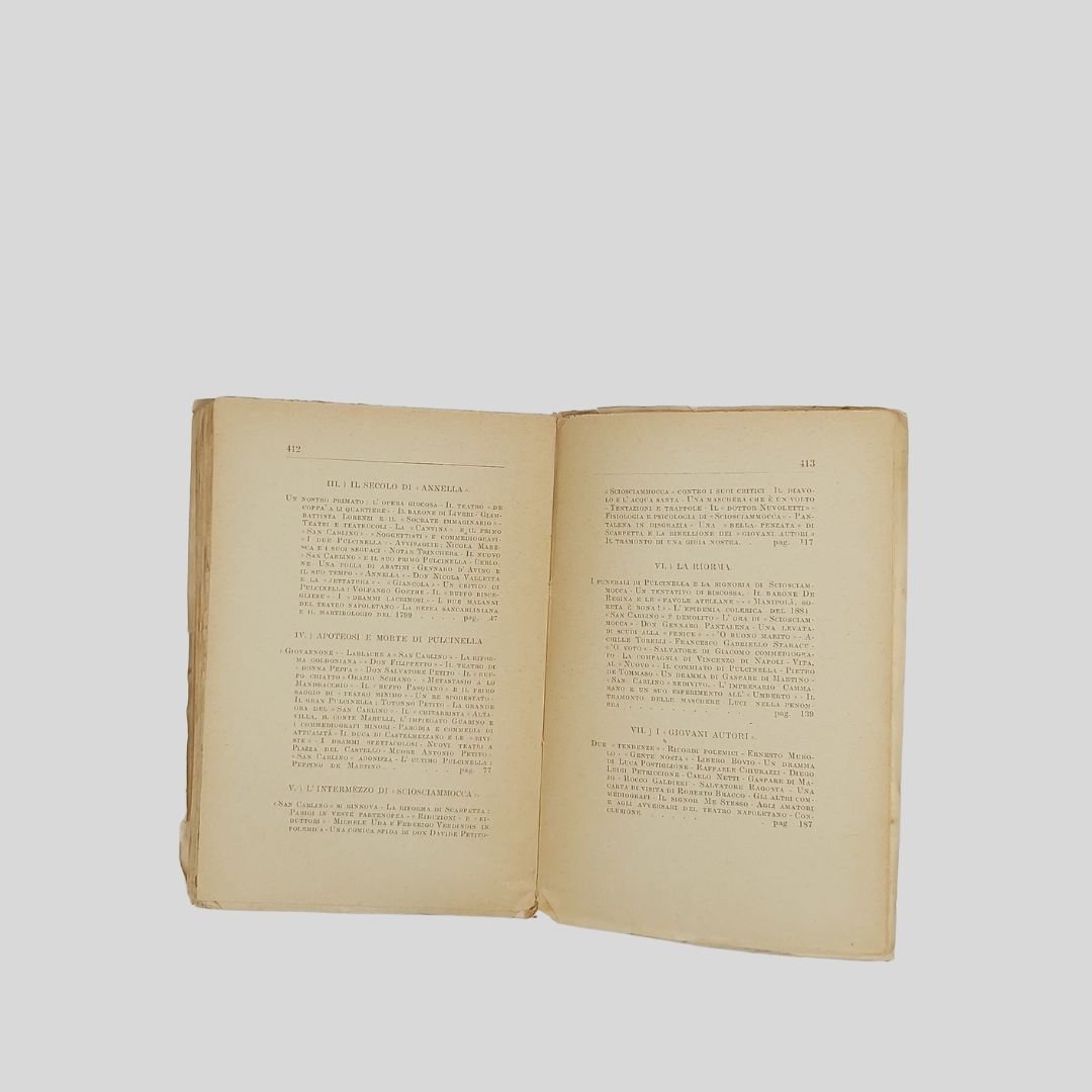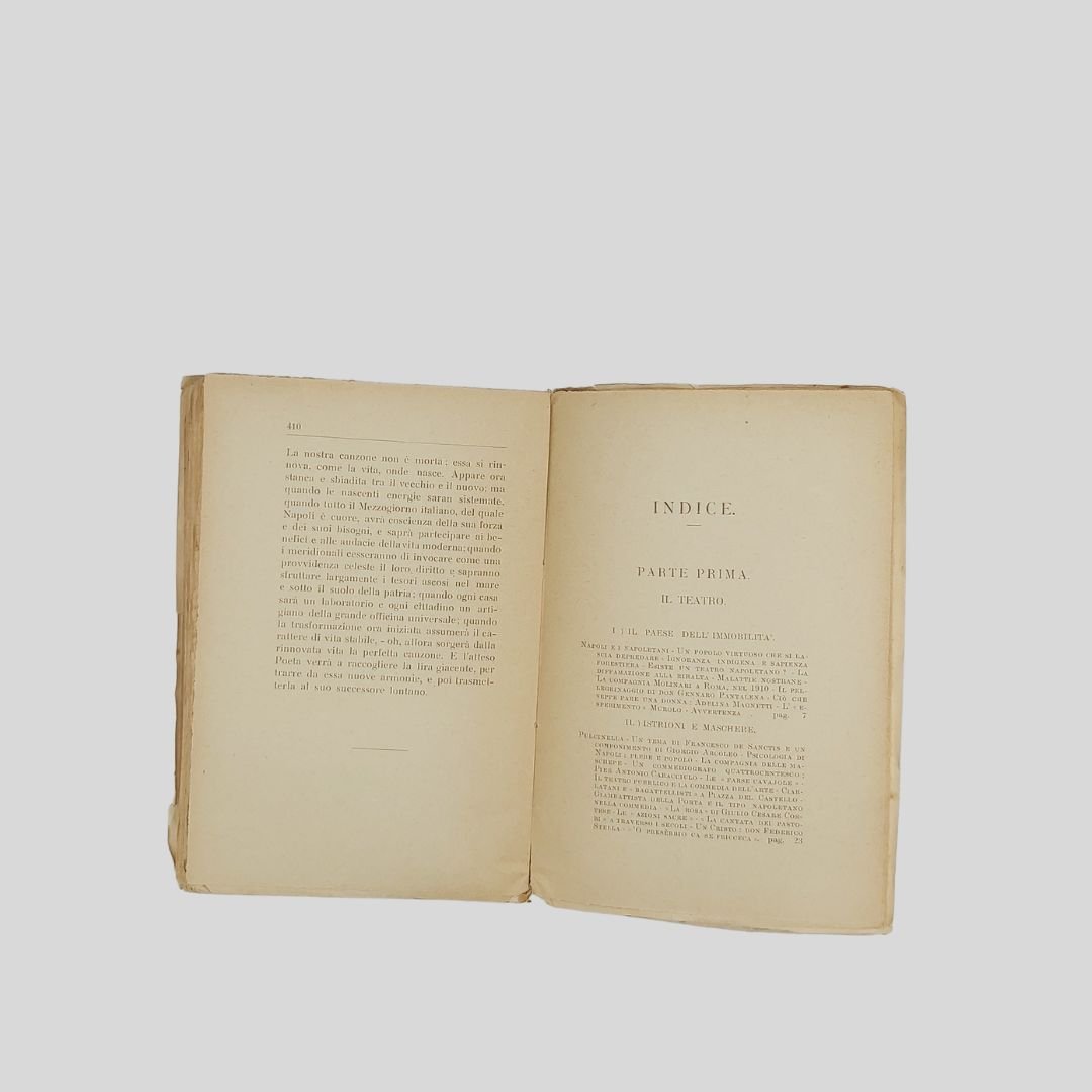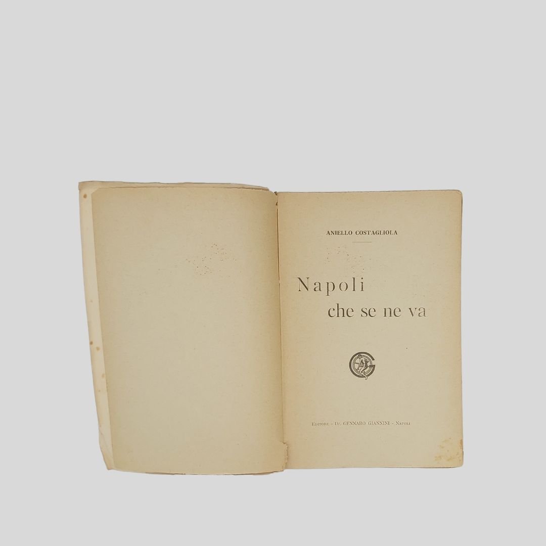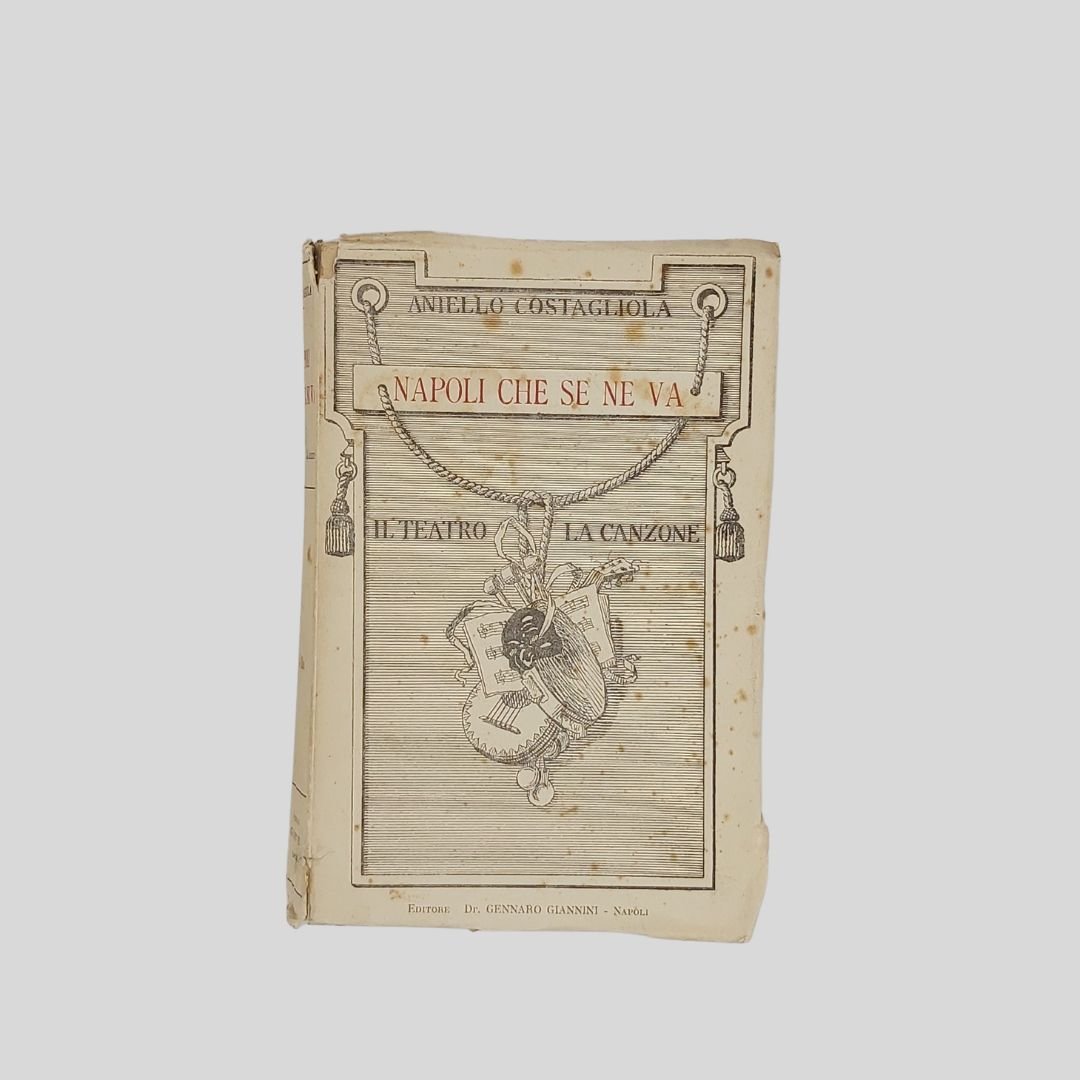 In-16° (cm 19,5), pp. 416. Tracce d’uso alla cop. con tracce di foxing. Interno in buono stato. Prima edizione. Non comune. Dall’indice: Le«Farse cavajole», Apoteosi e morte di Pulcinella, Antonio Petito, L’ultimo Pulcinella: Giuseppe De Martino, La riforma di Scarpetta, Sciosciammocca e Davide Petito, La ribellione dei giovani autori: Ernesto Murolo, Libero Bovio, Luca Postiglione, Raffaele Chiurazzi, Diego Petriccione, Carlo Netti, Gaspare Di Martino, Rocco Galdieri, Salvatore Ragosta, Roberto Bracco, Me stesso. L’ora delle «Villanella», Le canzoni di Masaniello, Quando cantava la «Zeza». Nelle schiere canore del nuovo secolo: Nicolardi, Murolo, Bovio, E. A. Mario, Califano, De Curtis, Fonzo, Buongiorno, Valente, Lama, «Poliphon», La canzone industriale, Canzoni di mala vita… Aniello Costagliola [Napoli 1871 -ivi 1928]. Drammaturgo, esponente di rilievo del “teatro d’arte napoletano” assieme a Roberto Bracco, Ernesto Murolo, Salvatore Di Giacomo, F. G. Starace…