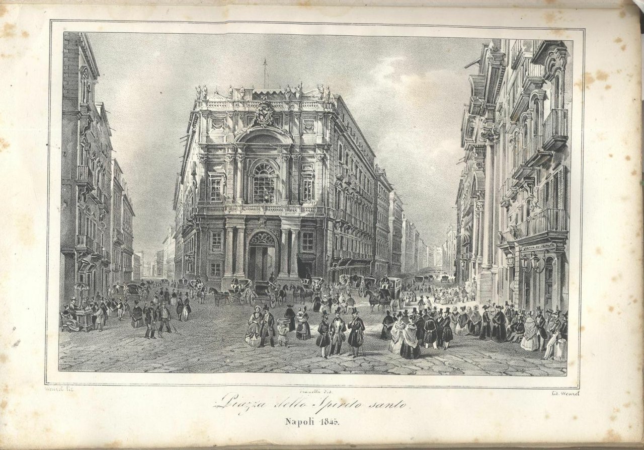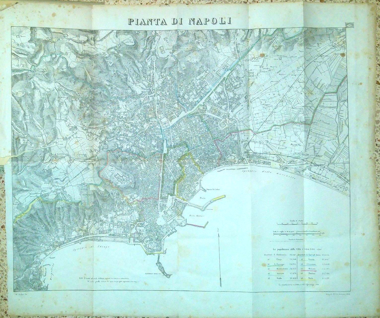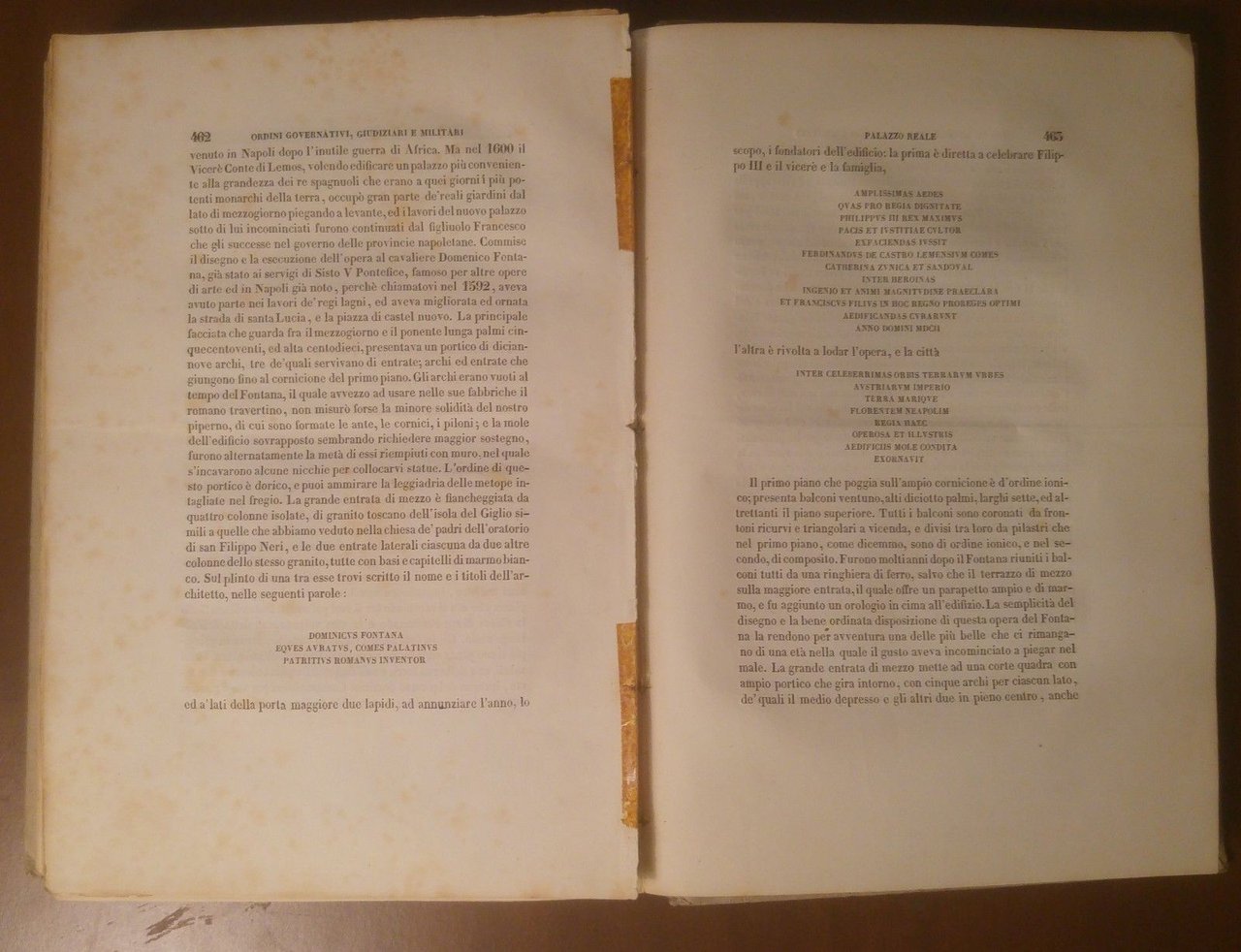 Volume I: (12) + 542 Pagine, conserva 11 delle 15 tavole con veline protettive fuori testo e la grande mappa di Napoli con i confini acquerellati. Mancano le tavole 1 (Napoli da mare) 4 (Piazza S. Domenico Maggiore) 12 (piazza della trinità maggiore) 14 (piazza della reggia).