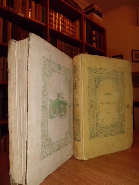 (Napoli). Autori vari. Napoli, s.e., 1845. NAPOLI e i luoghi celebri delle sue vicinanze. 2 volumi in - 4°, leg. orig. in cart. con titolo a stampa. (12), 542 pp. con 15 tavole di vedute incise in litografia protette da veline ed una grande pianta di Napoli ripiegata più volte f.t.; (4), 602, XXII, (2) pp. con 10 tavole di vedute incise in litografia ed una grande carta dei contorni di Napoli in fine. Si trova aggiunta in fotocopia una carta di Pompei. Opera pubblicata in occasione del Settimo Congresso Scientifico degli Italiani. Scritti di Stanislao d’Aloe, Raffaele D’Ambra, Mariano d’Ayala, Carlo Bonucci, Cesare Dalbono, Francesco Puoti, Bernardo Quaranta. Le tavole sono disegnate da Achille Vianelli e litografate da Wenzel e Zezon. Esemplare in ottimo stato; solo la legatura è un po' logora. Opera pregevole e ricercatissima. Uff. Mob. 2.