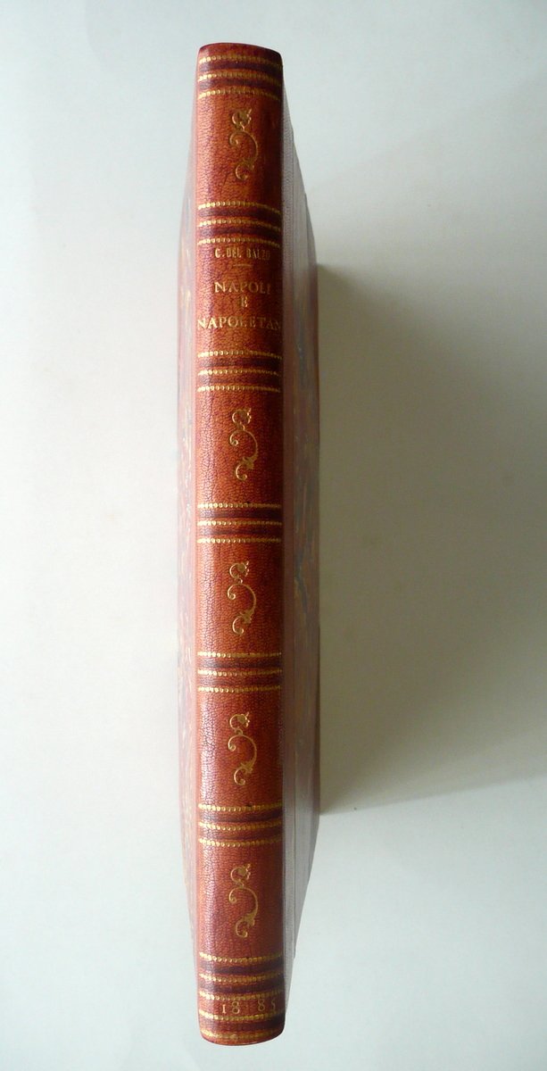 Carlo del Balzo, Napoli e i napoletani Opera illustrata da Armenise, Dalbono e Matania Fratelli Treves, Milano 1885, cm 31x22, pp. 316 con numerosissime ill. incise in b/n nel t. e fuori t. (qualcuna anche su due pagine); bella legatura amatoriale moderna in mezza pelle (dorso e angoli) con titolo e alcuni fregi impressi in oro al dorso; piatti in carta marmorizzata con filetti impressi in oro (vedi foto). Angolo sup. del piatto ant. con applicato un piccolo ex libris Jacobi Manzoni". Condizioni di conservazione Coperta molto ben conservata con pochi minimi difetti; piatto post. con qualche piccola leggera abrasione (vedi foto). Interni ben conservati con tracce d'uso, qualche piccola lieve brunitura e alone; angolo inf. del risguardo ant. con una traccia di piccola pieghetta. Con numerose belle illustrazioni incise in bianco e nero sia nel testo che fuori testo (qualcuna anche su due pagine). Bella opera illustrata, rilegata in elegante mezza pelle amatoriale moderna, con titolo e alcuni fregi impressi in oro al dorso; piatti in carta marmorizzata con filetti impressi anch'essi in oro. Un angolo superiore del contropiatto anteriore reca applicato l'ex libris "Jacobi Manzoni". SETT98.L9208 N "
