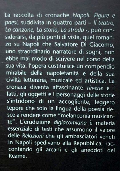 La raccolta di cronache "Napoli. Figure e paesi", suddivisa in quattro parti – Il teatro, La canzone, La storia, La strada -, può considerarsi, da più punti di vista, quel romanzo su Napoli che Salvatore Di Giacomo, uno straordinario narratore di sogni, non ebbe mai modo di scrivere nel corso della sua vita: l’opera costituisce un compendio mirabile della napoletanità e della sua civiltà letteraria, musicale e artistica. La cronaca diventa affascinante rêverie e i fatti, gli oggetti e i personaggi delle storie s’intridono di un accogliente, leggero tepore che solo la lingua della poesia riesce a rendere come “melanconia musicante”. L’erudizione digiacomiana è materia essenziale di testi che assumono il valore delle Relazioni che gli ambasciatori veneti in Napoli spedivano alla Repubblica, raccontando gli arcani e gli aneddoti del Reame.