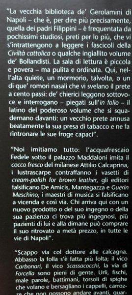 Soggetti: Napoli, Cronache, Letteratura, Napoletanità, Cultura, Storia locale, Classici, Narrativa, Saggi Letterari, Luci e ombre napoletane, Poesia, Canzone napoletana, Poetica, Antropologia, Sociologia, Regno, Biblioteca dei Gerolamini, Vita quotidiana, Aneddoti, Personaggi illustri, Centro storico, Quartieri, Fondaco, Vicoli, Acquafrescaio, Ambulanti, Musica, Forcella, Strade, Viaggio, Mestieri, Teatro, San Carlo, San Carlino, Casacciello, Zeza, San Ferdinando, Canzoni, Fenesta ca lucive, Colera, Marechiaro, Piedigrotta, Te voglio bene assaie, Feste, Masaniello, Pulcinella, G.B. Della Porta, Toledo, Chiaja, Dialetto napoletano, Celebrità, Antonio Petito, Vincenzo Gemito, Domenico Morelli, Giacinto Gigante, Luisa Sanfelice, Matilde Serao, Raffaele Sacco, Raimondo di Sangro, Domenico Sarro, Sciantosa, Giulio Cesare Cortese, Cicerenella, Vincenzo La Grua, Bello Gasparre, Carlo Gesualdo, Angelo Carasale, Edoardo Scarfoglio, Quinzio, Camorra, Risanamento, Santa Chiara, 'O mese mariano, Assunta Spina, Novelle, Porta Capuana, Edizioni critiche, Gente, Libri Vintage, Fuori catalogo, Antologie, Raccolte, Naples, Chronicles, Literature, Neapolitan Culture, Local History, Classics, Fiction, Literary Essays, Neapolitan Lights and Shadows, Poetry, Neapolitan Song, Poetics, Anthropology, Sociology, Kingdom, Library of Gerolamini, Daily Life, Anecdotes, Famous People, Old Town, Neighborhoods, Vicolo Scassacocchi, Carbonara, Street Vendors, Music, Roads, Travel, Crafts, Theater, Songs, Cholera, Parties, Neapolitan Dialect, Celebrities, Rehabilitation, Novels, Critical Editions, People, Books Out of print, Anthologies, Collections, Pasquino
