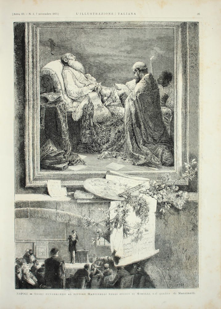 Napoli. Onori funebri al pittore Mancinelli nello studio di Morelli. Stampa 1876
