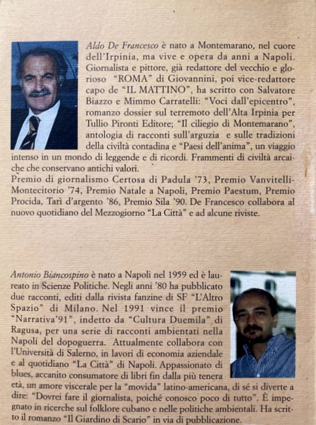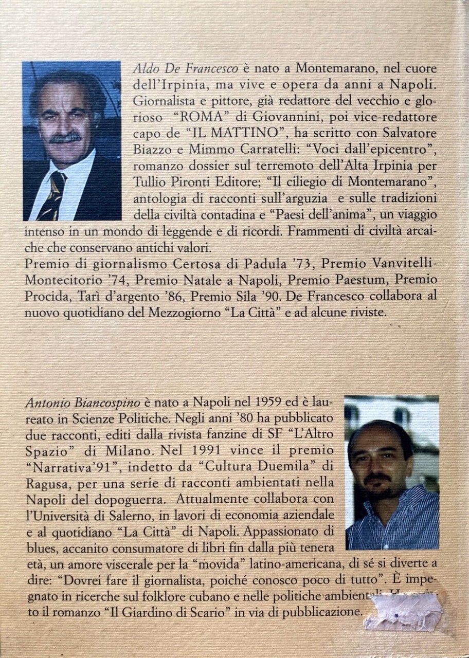 Aldo De Francesco. Giornalista, scrittore e pittore di origini irpine, vive e opera a Napoli. È stato redattore del vecchio Roma, di cui è attualmente editorialista, poi viceredattore capo de Il Mattino. Vincitore di molti premi di giornalismo, rigoroso studioso della storia di Napoli e di tradizioni popolari, è un attento cultore della pittura, che coltiva con passione e severo rispetto. Ha pubblicato: Ultime voci dall’epicentro (1981), Il Ciliegio di Montemarano (1992), Paesi dell’anima (1995), Napoli Ultima Edizione (1996), Palazzo Salerno, la storia e i protagonisti (1997), Dal Convento ai lager e ritorno: la vita eroica di Padre Pio Ricciardelli (1998), I miei anni con Padre Pio (2002), Il Carnevale di Montemarano (2003), Bagno Elena in Posillipo dal 1840: due secoli di estati napoletane (2004). Per Iuppiter Edizioni ha pubblicato Piazza Napoli(2009), Il sindaco della Prima Repubblica (2010), la raccolta di poesie dialettali Viento ‘e cimma (2011), Il Novellino montemaranese: personaggi e umorismo nel paese de Lo cunto de li cunti (2012) e Festabarocca (2014).