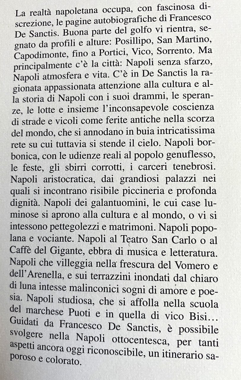 La realtà napoletana occupa, con fascinosa discrezione, le pagine autobiografiche di Francesco De Sanctis. Buona parte del golfo vi rientra, segnato da profili e alture: Posillipo, San Martino, Capodimonte, fino a Portici, Vico, Sorrento. Ma principalmente c'è la città: Napoli senza sfarzo, Napoli atmosfera e vita. C'è in De Sanctis la ragionata appassionata attenzione alla cultura e al la storia di Napoli con i suoi drammi, le speranze, le lotte e insieme l'inconsapevole coscienza di strade e vicoli come ferite antiche nella scorza del mondo, che si annodano in buia intricatissima rete su cui tuttavia si stende il cielo. Napoli borbonica, con le udienze reali al popolo genuflesso, le feste, gli sbirri corrotti, i carceri tenebrosi. Napoli aristocratica, dai grandiosi palazzi nei quali si incontrano risibile piccineria e profonda dignità. Napoli dei galantuomini, le cui case luminose si aprono alla cultura e al mondo, o vi si intessono pettegolezzi e matrimoni. Napoli popolana e vociante. Napoli al Teatro San Carlo o al Caffè del Gigante, ebbra di musica e letteratura. Napoli che villeggia nella frescura del Vomero e dell'Arenella, e sui terrazzini inondati dal chiaro di luna intesse malinconici sogni di amore e poesia. Napoli studiosa, che si affolla nella scuola del marchese Puoti e in quella di vico Bisi. Guidati da Francesco De Sanctis, è possibile svolgere nella Napoli ottocentesca, per tanti aspetti ancora oggi riconoscibile, un itinerario saporoso e colorato.
