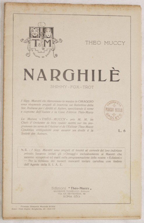 In 8. cm 27x17,5. Pp 13. partitura completa per orchestra del 1929 di una canzone. Caratteristica copertina illustrata d'epoca. In ottime condizioni. a complete score for orchestra of 1929. Carachteristic decorated cover of that period. In very good conditions.