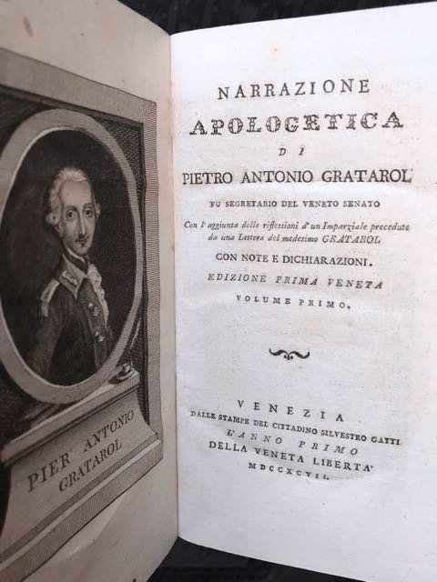 2 volumi in 1 in-8° (cm. 19,5), legatura di poco successiva in m. tela con titolo in oro al dorso e piatti marmorizzati, tagli spruzzati; pp. VI 228, 214 in buono stato (qualche sporadica fioritura) con 1 tavola di ritratto in antiporta. Noto libro del Gratarol che aveva l'obiettivo di salvare la sua reputazione dopo l'accusa di libertinaggio e la fuga da Venezia a Stoccolma, dove elaborò questa narrazione contro il governo della Serenissima, denunciandone intrighi e corruzione. La Repubblica di Venezia aveva condannato l'autore e vietato la diffusione dell'opera sotto pena di morte. Cfr. Cicogna 3219; Melzi II, 221. Esemplare molto buono. (SB3)