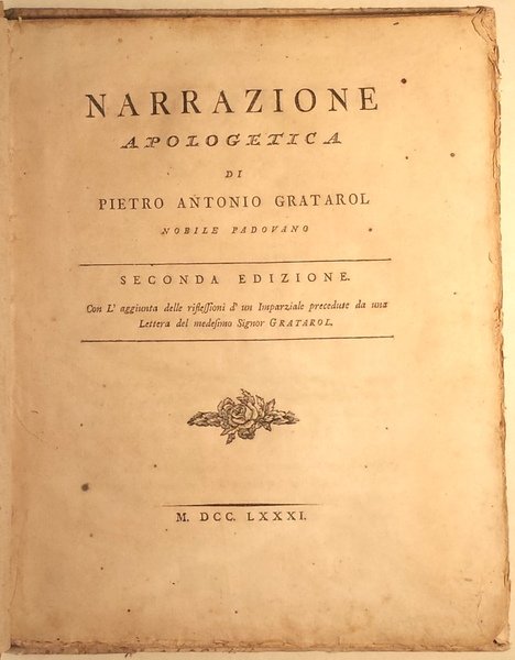 Narrazione apologetica di Pietro Antonio Gratarol nobile padovano. Seconda edizione con l'aggiunta delle riflessioni d'un Imparziale precedute da una Lettera del medesimo Signor Gratarol.