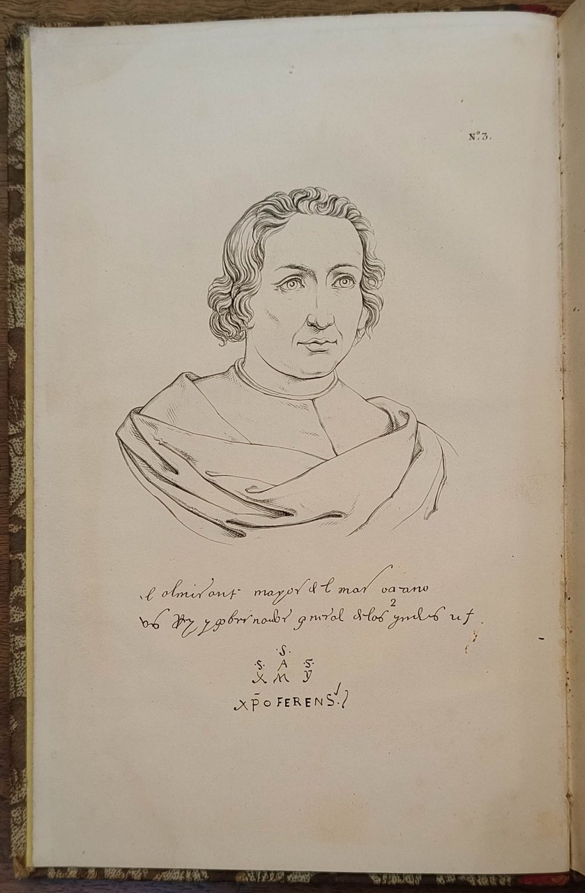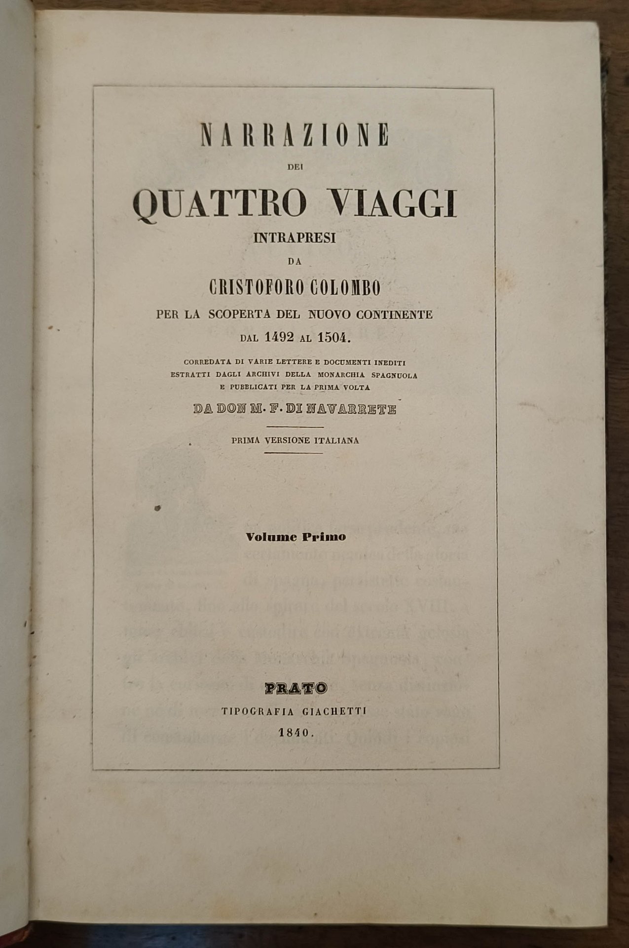Narrazione dei quattro viaggi intrapresi da Cristoforo Colombo, Prato, Giachetti, 1840. Cm 23,8. Pp. 551 459 (due volumi). Legatura in mezza pelle rossa e carta colorata verde. Titolo, numero e fregi impressi in oro al dorso. Lieve aloni d'acqua al margine del primo volume. Leggere fioriture sparse alle carte. 14 tavole incise in rame, una finemente colorata, raffiguranti ritratti, vedute e carte. Narrazione corredata da lettere e documenti provenienti dalla monarchia spagnola, pubblicati qui per la prima volta.