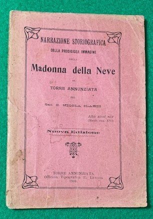 In 12°; 22, (2 b.) pp. e una c. di tav. fotografica con immagine della Madonna miracolosa. Prima ed unica rara edizione, nessun esemplare censito in ICCU, di quest'opera storiografica dedicata alla miracolosa immagine della Madonna della Neve di Torre Annunziata scritta da noto storico e studioso, Don Nicola Ilardi che fu autore di diverse opere di interesse locale. Prima ed unica edizione, rarissimo.